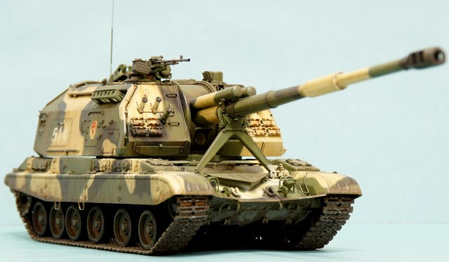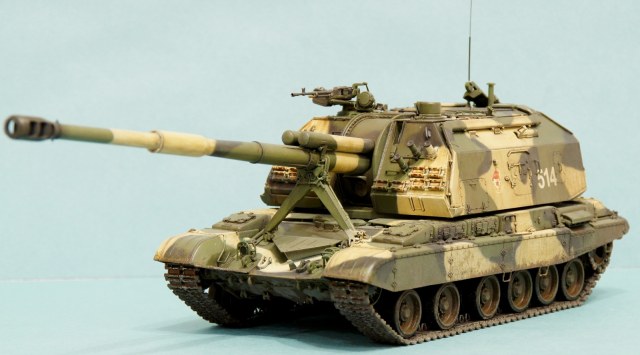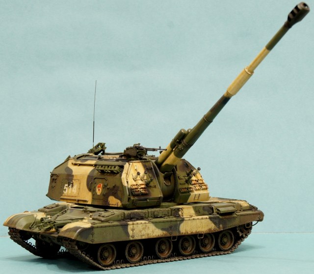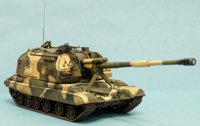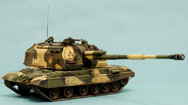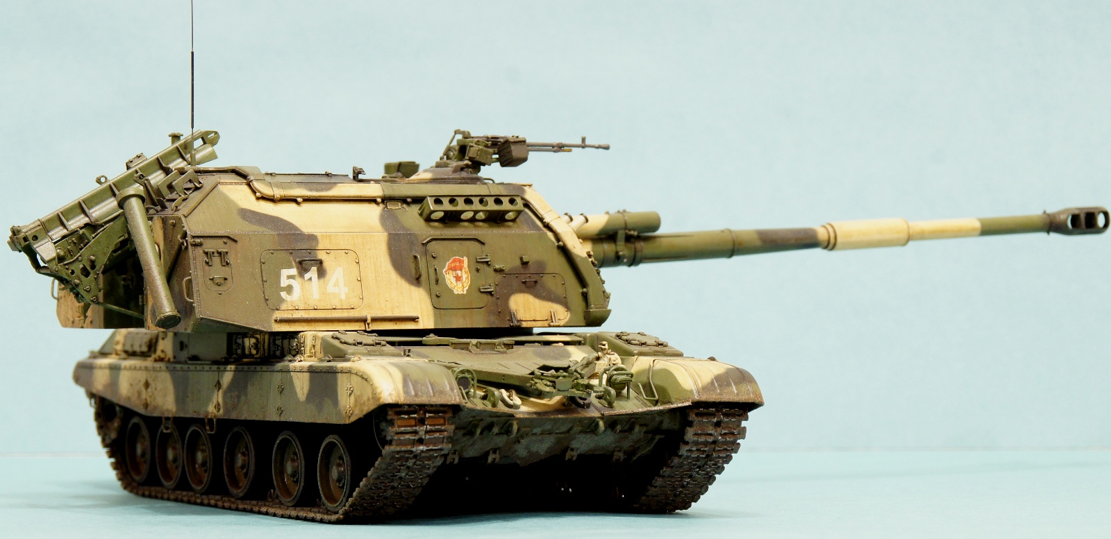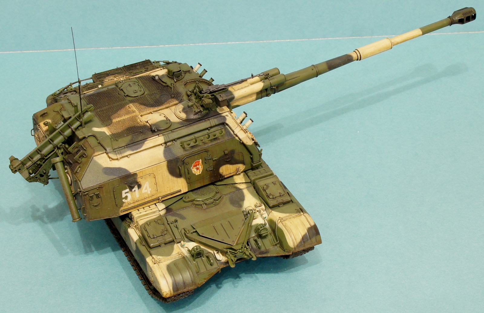По окраски. Первый раз попробовал грунт и краску "Vallejo". Мне понравилось. Самое главное она разводится водой, но я использовал водку. Единственное под аэрограф она была слишком жидкая и получались кляксы. Но в процессе приноровился. Основным цветом (зеленый) модель покрыта полностью. Песочные пятна сделана по маскам. Черные пятна без масок. Далее фильтры, масляные точки красками "MIG". Матовый и глянцевый лаки "TAMIYA".