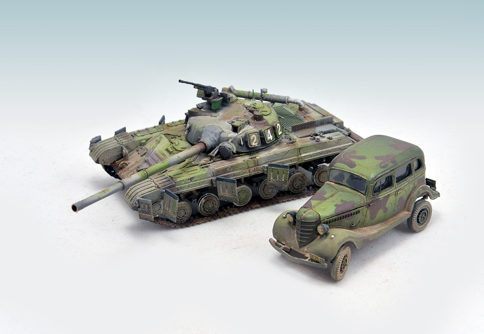 Те же фары, например, которые одна вниз, другая вверх смотрят, или с запылением поаккуратнее поработать, а то видна чёткая грань по "ватерлинии" стыка половинок кузова. Немного сточить толщину бамперов, разместить их по месту, не так низко, покрасить подножки в резиновый цвет, крыша фактурой от кузова отличаться должна, брезент там.