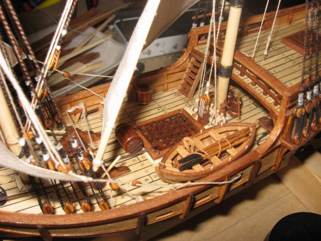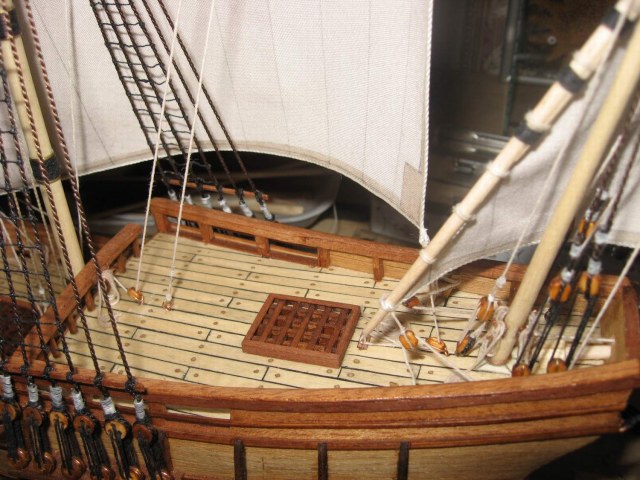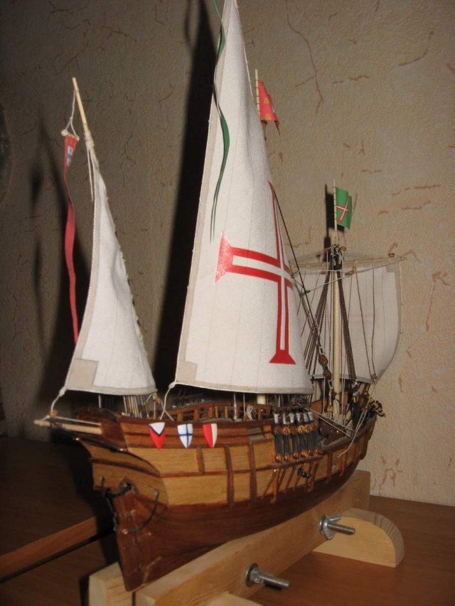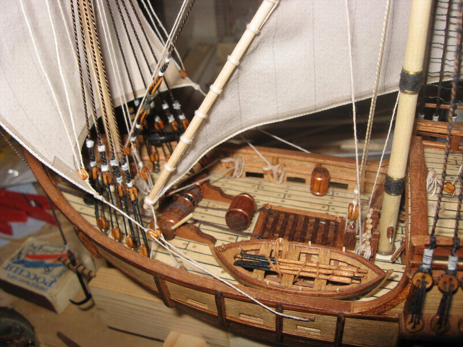 Первый опыт постройки из дерева. Просто давно хотелось построить. Масштаб 1:75. Построена полностью с нуля из подручных материалов, без использования покупных деталей и частей. Обшивка красное дерево и дуб, палуба осина, рангоут береза. Металические части медь. Паруса подкладочная хб ткань.