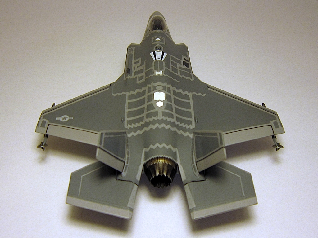 Сейчас на руках италериевский вариант F-35, в деталях и подробностях в чем-то получше (двигатель «в сеточку», проводка на стойках шасси, еще что-то там в носу…), но зубы и пилы подняты на небывалую высоту над обшивкой, в реальном масштабе – миллиметров на 20-30. Академиевский тоже этим страдает (особенно после окраски кистью поверх базы), но страдает меньше.