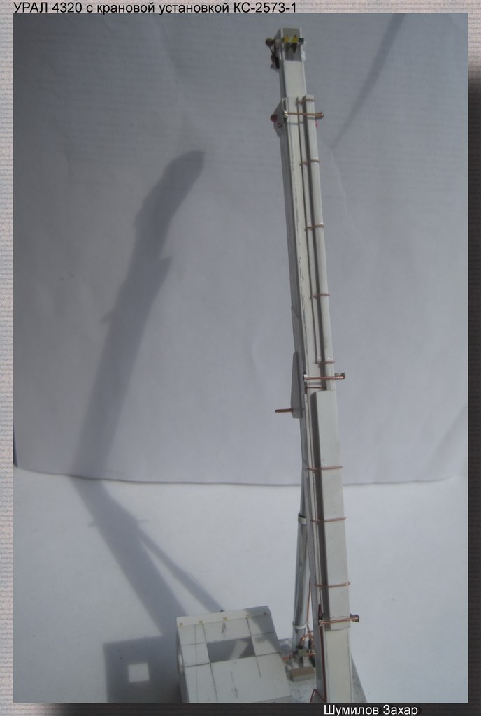 За основу был взят кит УРАЛа от трубача. Крановую установку сделал из листового пластика и различным трубочек. Старался сделать модель максимально подвижной. Самым сложным оказалось натяжение троса, он постоянно порывался перекрутиться.