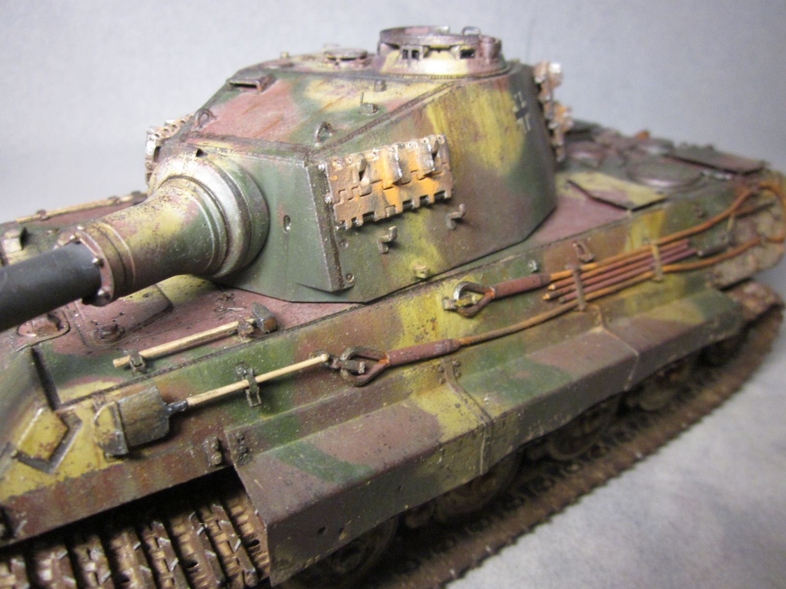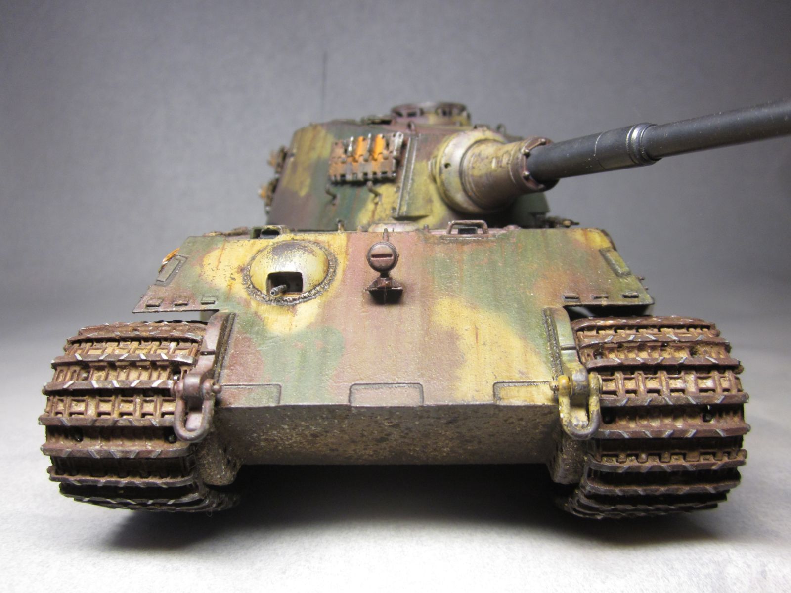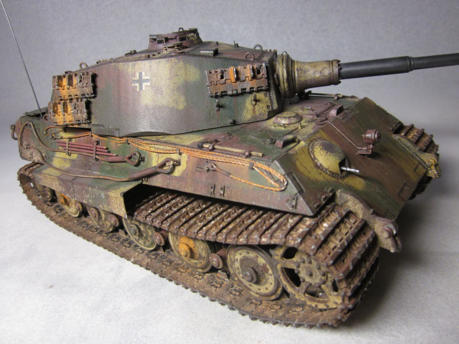 Здравствуйте колеги.Хочу представить на ваш суд модель Tiger Ausf.B.Я долго искал прототип для данной работы,но так и не нашел вариант,который соответствовал бы моему видению как,должна выглядеть модель.Что меня никак не огорчило,так как есть повод поимпровизировать,для творческого человека импровизация,это очень даже полезно.В итоге получилась авторская работа.Набор откровенно говоря мне особо не понравился,какойто никазистый,как и инструкция к нему (Kit.№6662).Для деталировки я использовал два набора Aber,основной и защитные борта.Кое что брал из набора Eduard.Траки Friulmodel.Ствол пушки точеный,был в наборе.Буксирные петли RB Model.Тросы Eduard.Болты,заклепки MasterClub.Выхлопные патрубки Москит.Все ручки,проводка,вентиляция баков из проволки.Поскольку в конце войны в немецких частях был дефецит краски,камуфляж наносился довольно посредственно и быстро изнашивался,а зачастую танки выходили на поле боя в заводском грунте.Я решил подчеркнуть этот факт.Прежде чем нанести пятна камуфляжа на базовый грунт,я задул всю модоль жидкостью от АК с эфектом лущения краски.После нанесения пятен с помощью жесткой кисти и воды был достигнут нужный эфект износа краски.Для базового окраса и камуфляжа,использовались краски TAMIYA и Vallejo.Кресты задувал самостятельно.Ствол пушки по задумке был заменен в полевых условиях,поэтому я решил зделать его натурально стального цвета.Вся дальнейшая тонировка:масло,смывки,фильтры,пигменты,продукция MIG и АК.Спасибо за внимание.