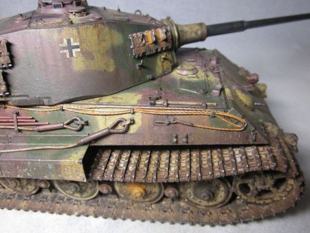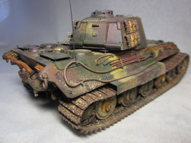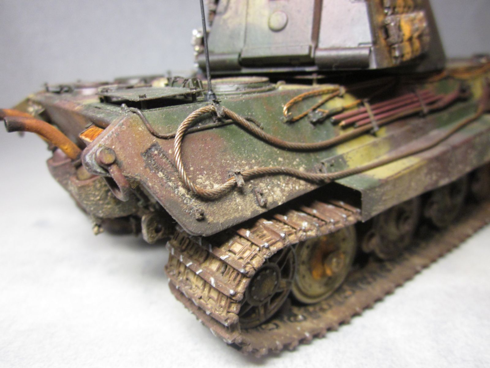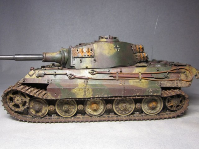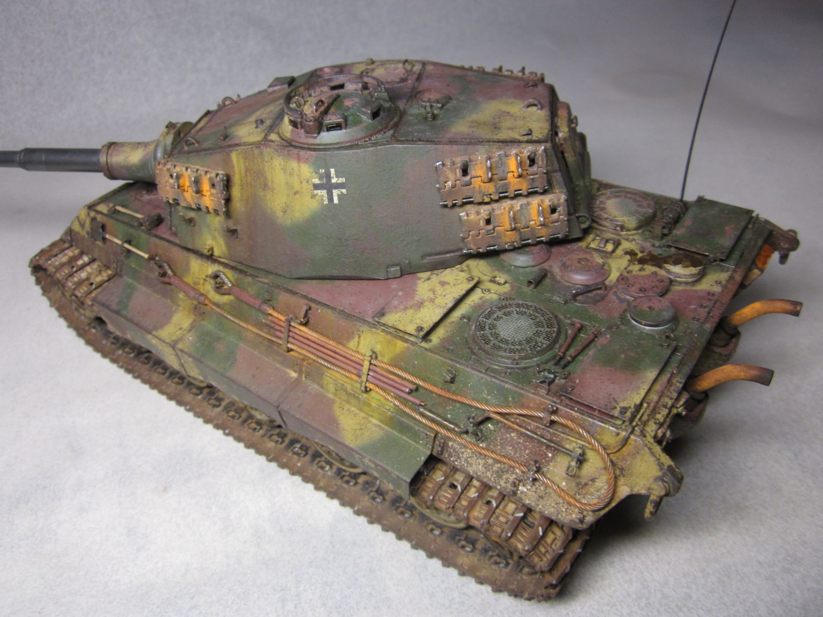 Здравствуйте колеги.Хочу представить на ваш суд модель Tiger Ausf.B.Я долго искал прототип для данной работы,но так и не нашел вариант,который соответствовал бы моему видению как,должна выглядеть модель.Что меня никак не огорчило,так как есть повод поимпровизировать,для творческого человека импровизация,это очень даже полезно.В итоге получилась авторская работа.Набор откровенно говоря мне особо не понравился,какойто никазистый,как и инструкция к нему (Kit.№6662).Для деталировки я использовал два набора Aber,основной и защитные борта.Кое что брал из набора Eduard.Траки Friulmodel.Ствол пушки точеный,был в наборе.Буксирные петли RB Model.Тросы Eduard.Болты,заклепки MasterClub.Выхлопные патрубки Москит.Все ручки,проводка,вентиляция баков из проволки.Поскольку в конце войны в немецких частях был дефецит краски,камуфляж наносился довольно посредственно и быстро изнашивался,а зачастую танки выходили на поле боя в заводском грунте.Я решил подчеркнуть этот факт.Прежде чем нанести пятна камуфляжа на базовый грунт,я задул всю модоль жидкостью от АК с эфектом лущения краски.После нанесения пятен с помощью жесткой кисти и воды был достигнут нужный эфект износа краски.Для базового окраса и камуфляжа,использовались краски TAMIYA и Vallejo.Кресты задувал самостятельно.Ствол пушки по задумке был заменен в полевых условиях,поэтому я решил зделать его натурально стального цвета.Вся дальнейшая тонировка:масло,смывки,фильтры,пигменты,продукция MIG и АК.Спасибо за внимание.