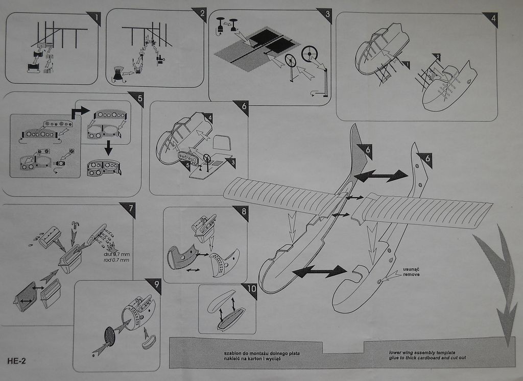 Модель от фирмы Hit Kit в масштабе 1/72 упакована в картонную коробку с верхним открытием. В наборе представлена модификация HE-2. Шорт-ран довольно неважного качества, присутствует много облоя. Хорошим дополнением служит плата с фототравлением от Eduard. Шкалы приборов даются на прозрачной плёнке. Декаль на 12 вариантов самолёта. Инструкция достаточно проста и наглядна.