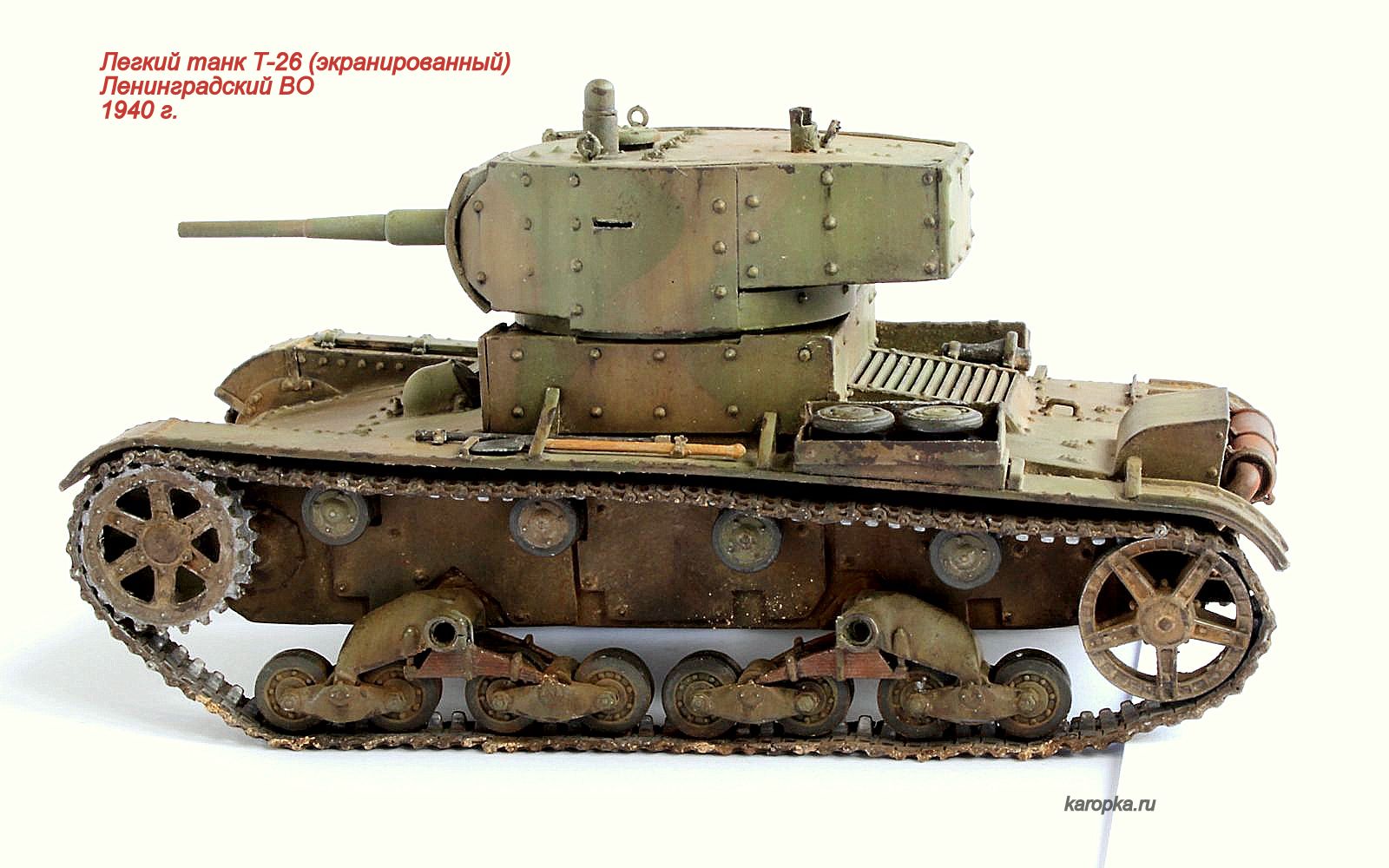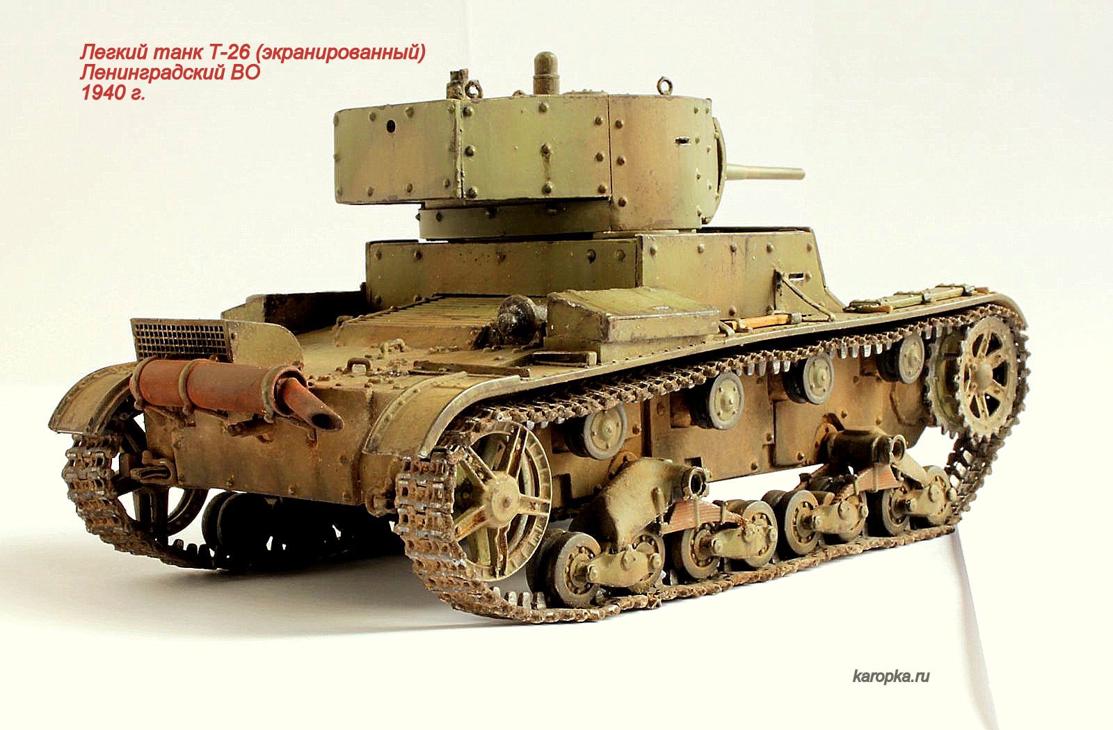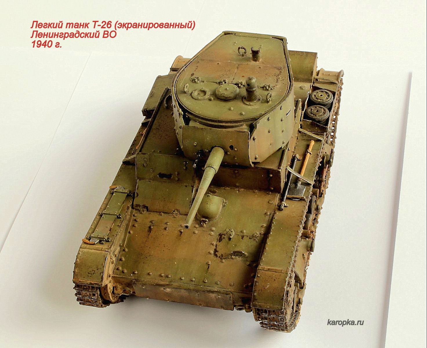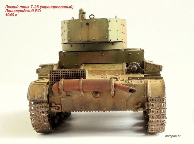 Модель делалась на основе "хоббибоссовского" Т-26 с применением набора дополнительной бронировки от "ХL", металических стволов от "МоделПойнт", поддерживающих катков от "Сталинградского фронта", гусениц от "Spade Ace Models".