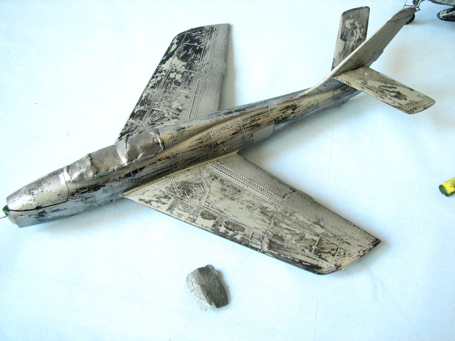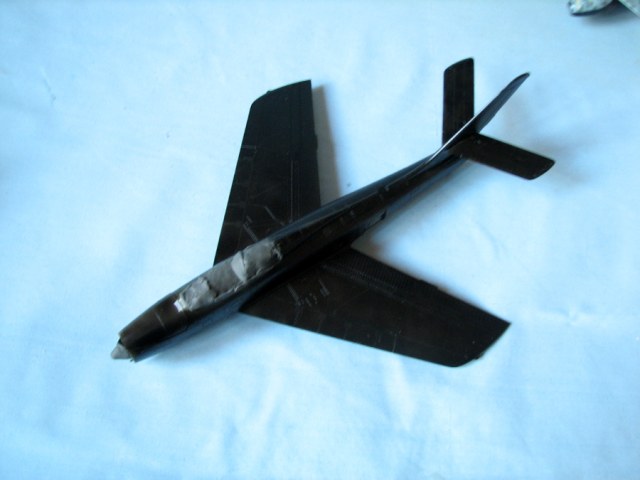 Модель от Итала, репак Кинетика, делалась в ГБ «Реактивная авиация 1950-55г.г.» , из-за проблем с серебристой краской, не успел к сроку. Переделал форму воздухозаборника, немного подшаманил кабину, сделал стенки ниш шасси и т. д. Красил ранее аэрозольной нитрой китайской фирмы «Мишель», но краска кончилась и когда вновь купил краску той же фирмы, оказалось, что теперь фирма выпускает акрил, как было написано на баллончике, но растворители не подходили — ни водка, ни Теккурила, ни 646, ни 650. Аэр засорялся, плевался, дикая шагрень... Модель была заброшена и недавно решил доделать ее.