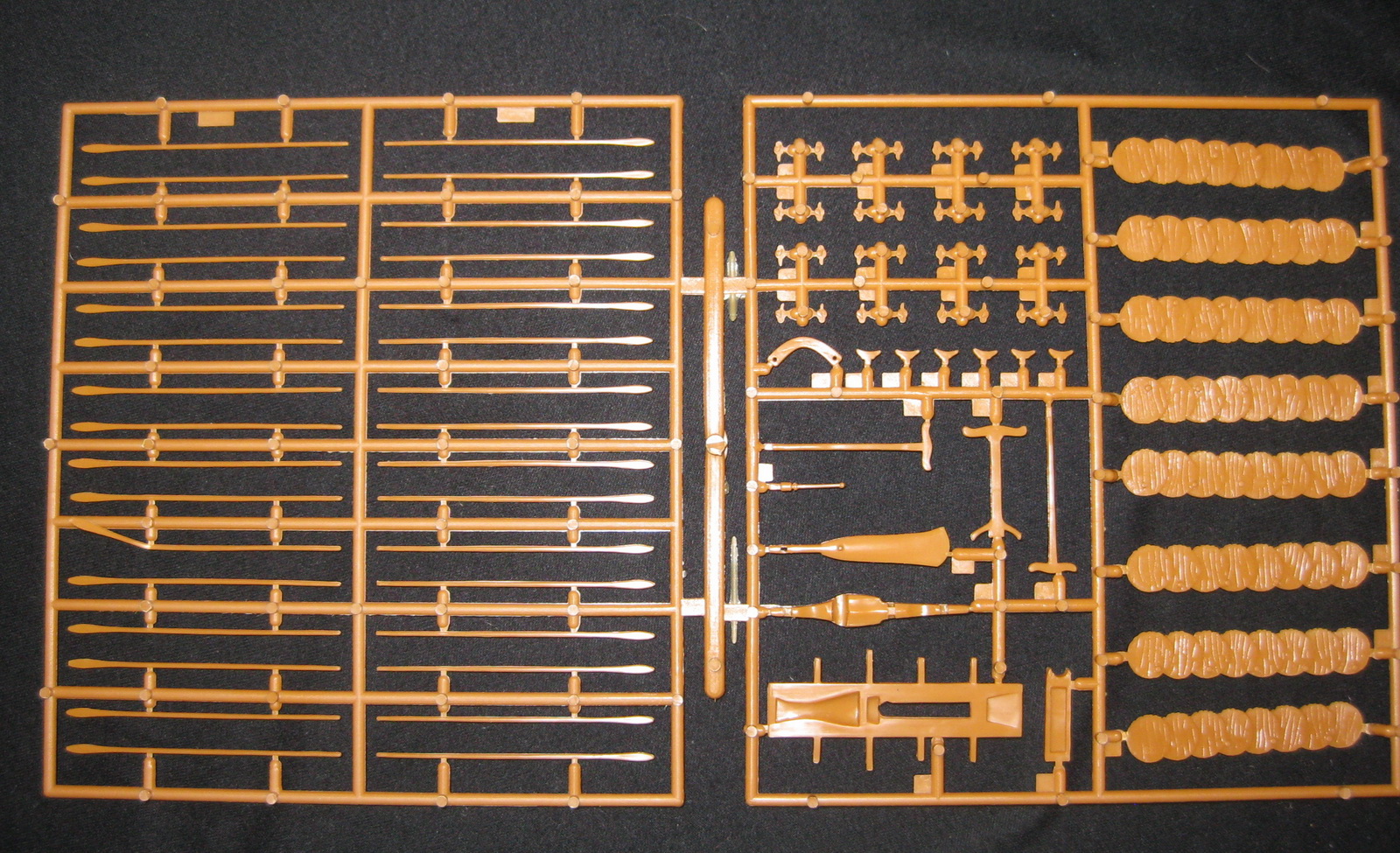 Коробка из плотного картона, в коробке три литника с деталями, инструкция на английском языке , парус и моток ниток.