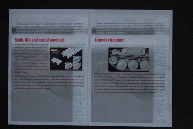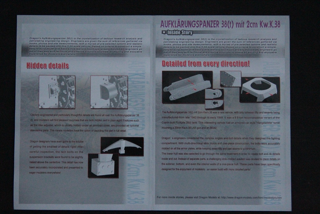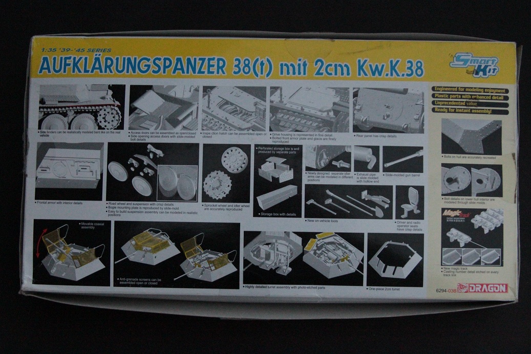 Коллеги, хочу представить вам, обзор довольно любопытной машины Aufklarungspanzer 38(t) mit 2cm Kw.K.38 от фирмы DRAGON номер в каталоге 6294. Сразу бросается в глаза это размер коробки она гораздо уже, чем стандартная драконовская коробка, даже у праги прямого родственника коробка шире. Открыв коробку, мы видим те же литники, что и у праги с большим количеством лишних деталей и новые с элементами башни, но как они поместились в такую узкую коробку? Да просто китайцы их порезали на две половины а так набор состоит из 5 больших литников серого пластика между прочим на предлагают машину почти с полной внутрянкой ну кроме двигателя, хотя в наборе с прагой он дается а тут видно пожадничали. Облоя, утяжин и прочей гадости я не заметил, дальше мы имеем один литник прозрачного пластика с деталями остекления и пятью мелкими с разной мелочевкой (причем приятно было увидеть антенну метелку, какое то приспособление на литнике наверно для придания правильной формы надгусеничным полкам), в наборе имеется две платы фототравления, коробочка с травлеными створками рубки,ванна корпуса идет отдельно, декаль состоящая, только из крестов, наборные траки даже имеют свои номера, но они настолько мелкие, что их и не видно совсем), и конечно инструкция, выполненная в виде гармошки. В общем набор очень хорош для изкоробочников , а для любителей попилить можно приобрести кучу травления на эту машину. Я бы поменял только ствол т.к пластиковый мне не по душе.