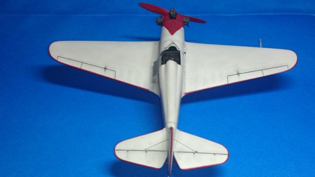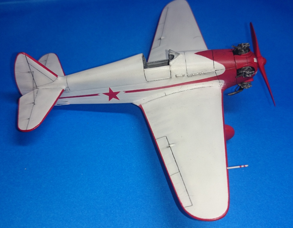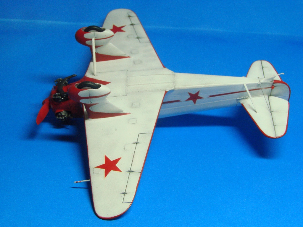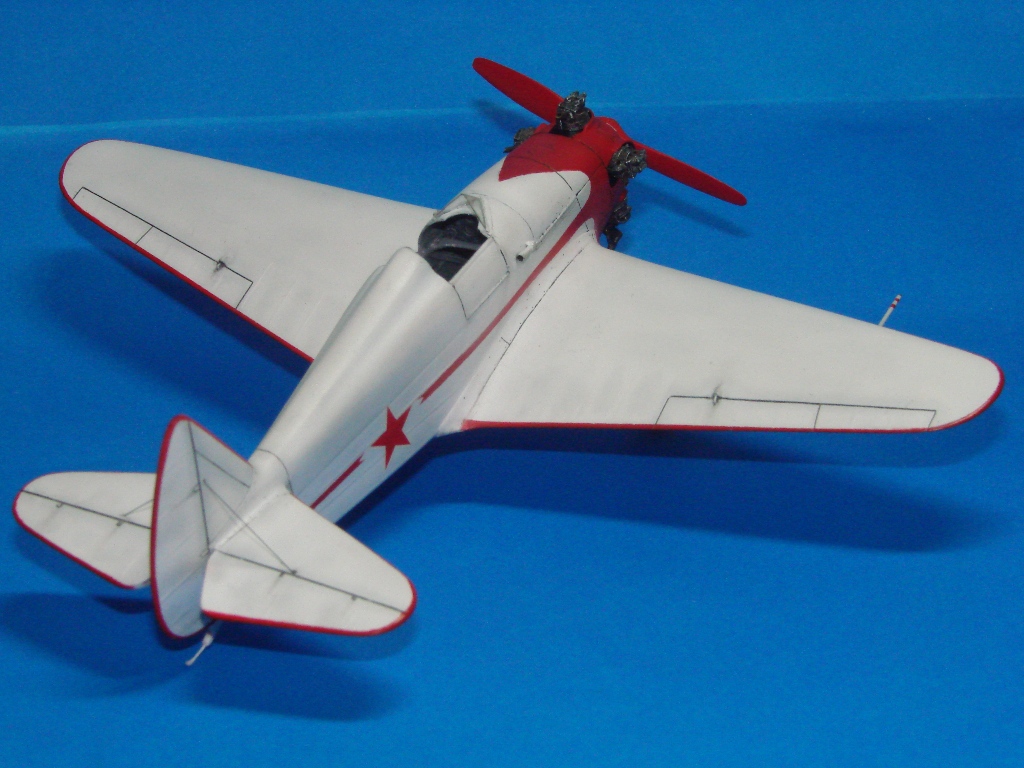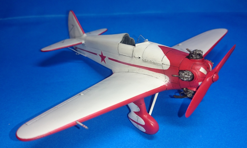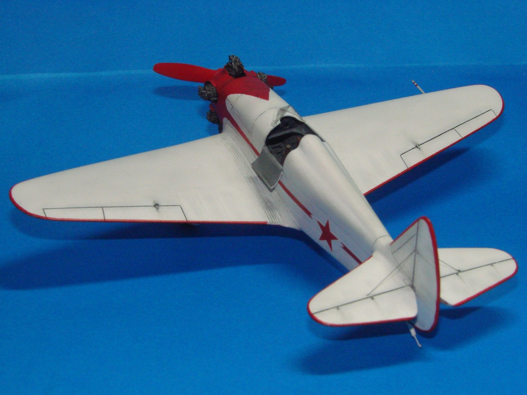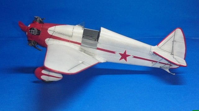 Модель представлена в окраске ОСОАВИАХИМ, один из многих. Конкретной привязки к борту нет. В инструкции представлена схема окраски в 48 масштабе, по ней я сделал шаблоны по которым нарезал маски. Простенький камуфляж я очень долго маскировал. Загрунтована модель Тамиевским грунтом. Окрашена белым – эмаль Tamiya, красый – Mr. COLOR. Декали в наборе отсутствуют, поэтому звезды из других наборов. Лак от Mr. COLOR, пачкал маслом с пиненом.