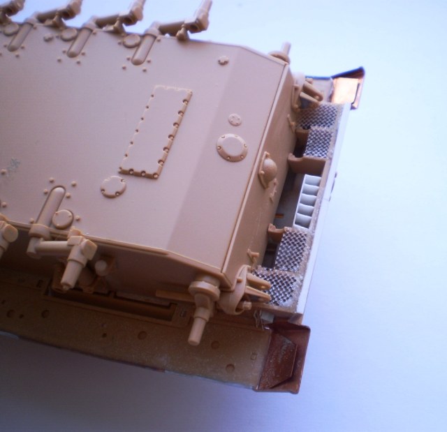 Доработки: "крылья",их отбойники сверху и снизу(на задних),отбортовка надгусеничных полок. Кронштейн под зенитный пулемет, барахольная корзина,стекляная фара, крепежи под трос, шанец, да и сам шанец, отсеки дымшашек,сетка снизу и сверху.