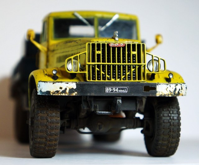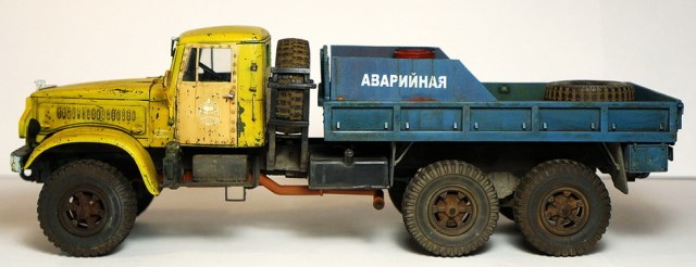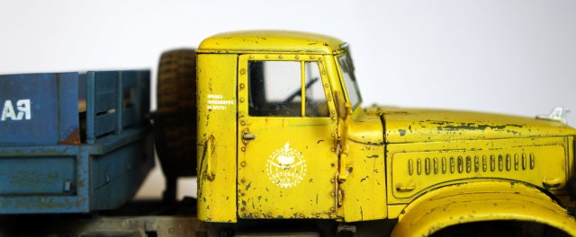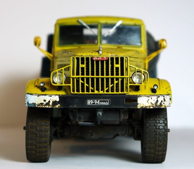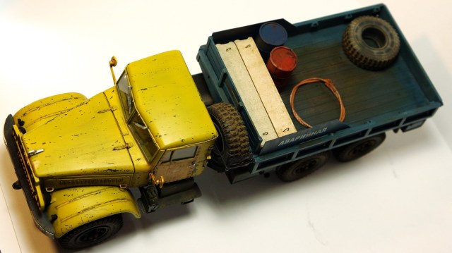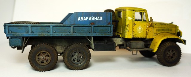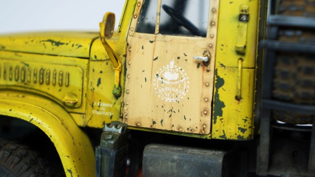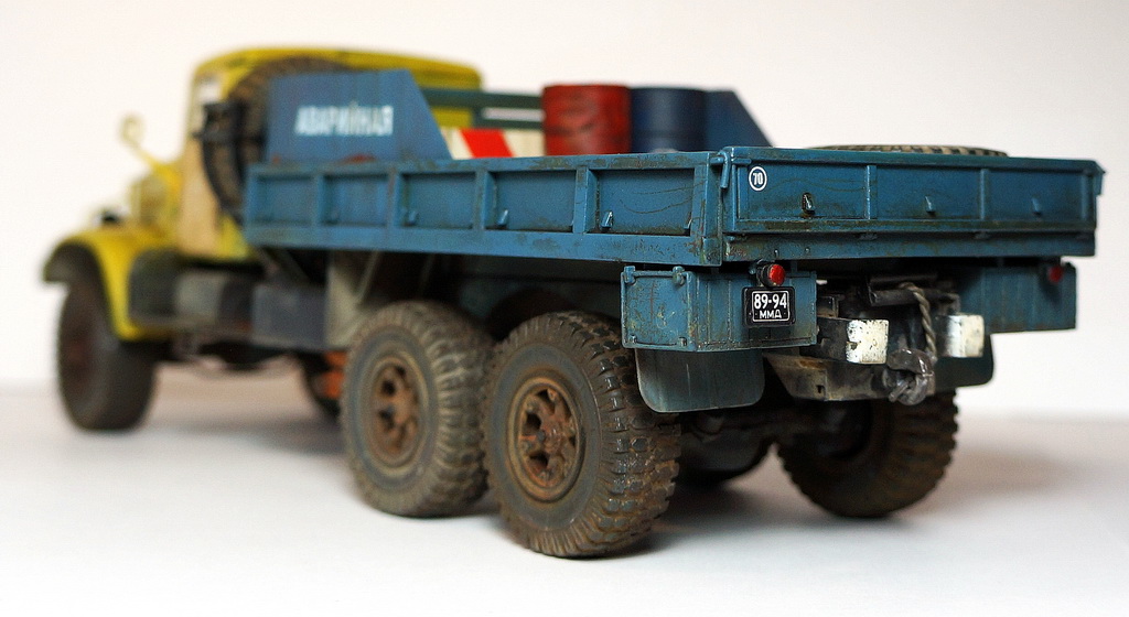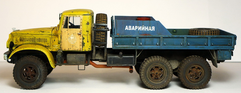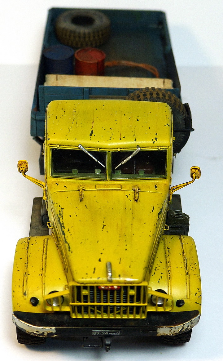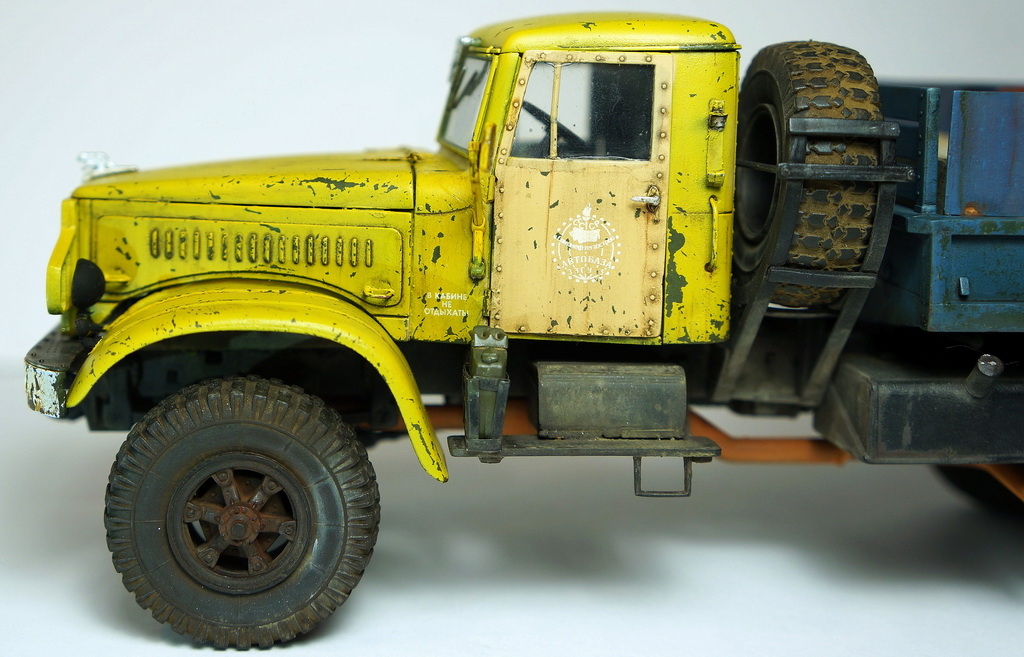 Спасибо! По сколам, изначально на заводе грузовик был окрашен в защитный зеленый, а по списанию грубо перекрашен в гражданский цвет "аварийной службы". По собственному опыту знаю, что как правило технологий окраски ни кто при этом не соблюдает, красят зачастую под открытым небом и т.д., в результате чего через незначительный промежуток времяни краска от контакта с окружающей средой, от веток по крыше в часности слазает пластами