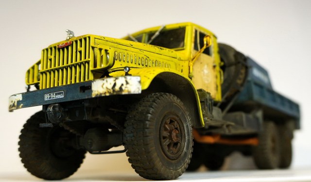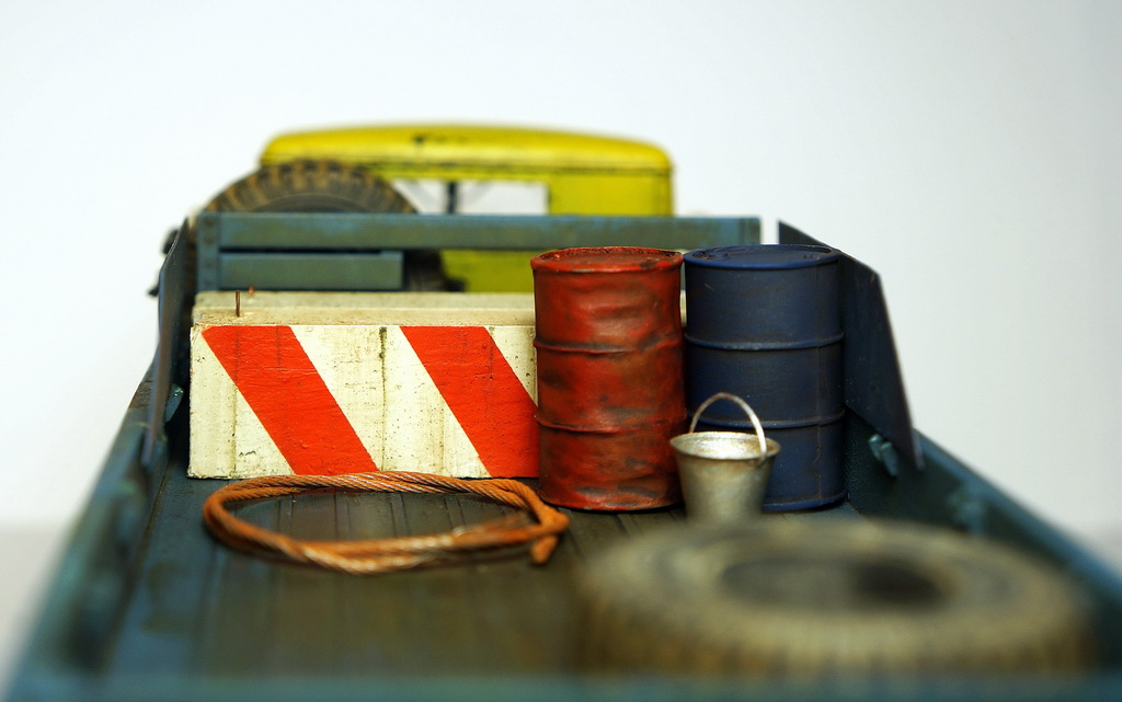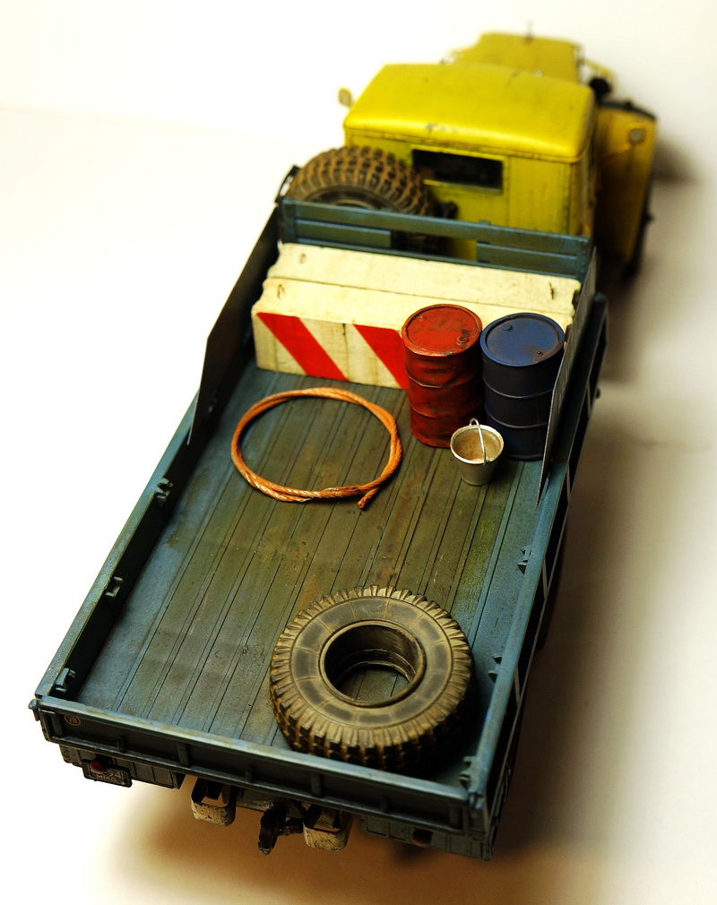 сам ЯАЗ собран из коробки, установлены зеркала от УРАЛа (заколхозил один из водителей для лучшего обзора...)))). Снята одна запаска, сделан держатель для огнетушителя, петли на капот, доработанны борта, установлена оптика эльф, бетонные блоки Zebrano, канистры и ведерко из тамиевского набора + декали неизвестной фирмы. Красилось все Mr. Hobby, сколы и весь везеринг жидкости AK interactive, грязь и пыль "Мастер пигмент" .
