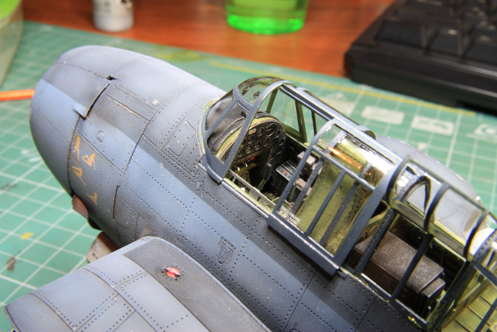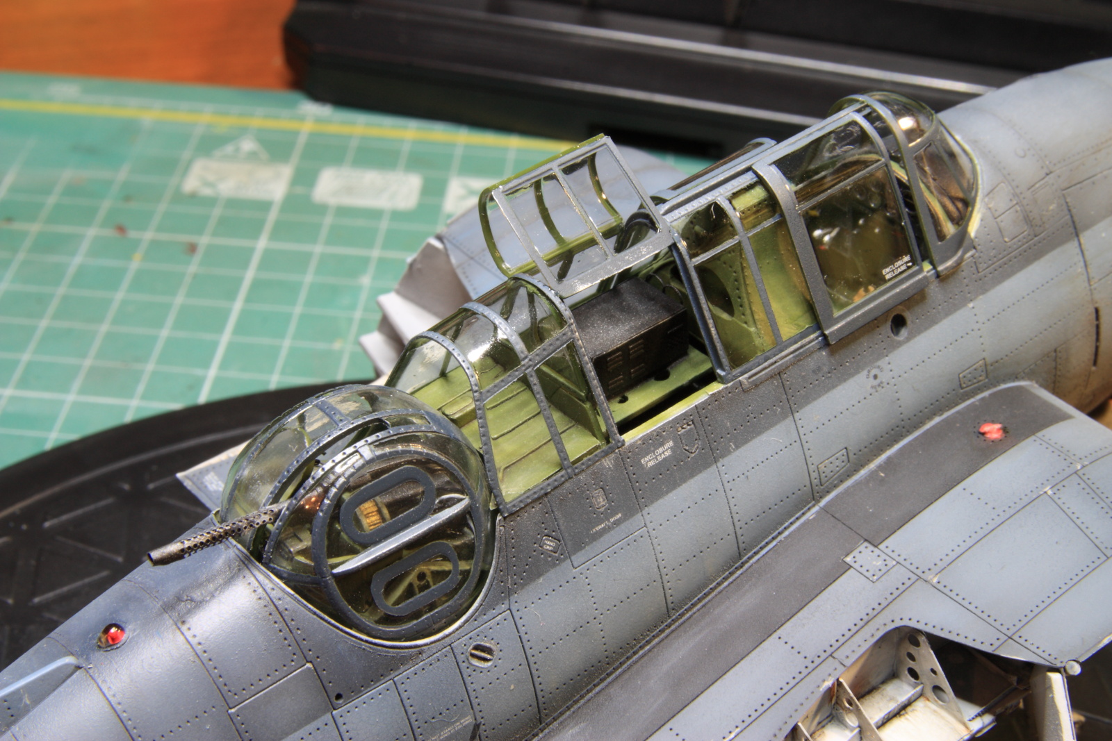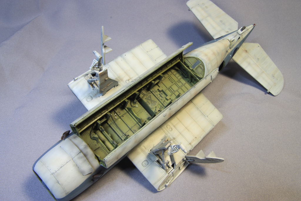Набор от ХоббиБосса №80314 довольно неплох по качеству. Пластик приятен, и легок в обработке. Довольно большие проблемы возникли при монтаже внутренних перегородок, и вклейке пола кабины пилотов, моторамы, так как деление деталей на мой взгляд не совсем удачное, пол кабины и «крыша» бомбоотсека приклеиваются друг к другу, а потом данная конструкция вклеивается в половинки фюзеляжа. Тем не менее шпаклевки понадобилось не так и много.