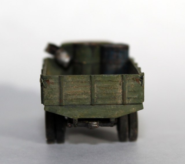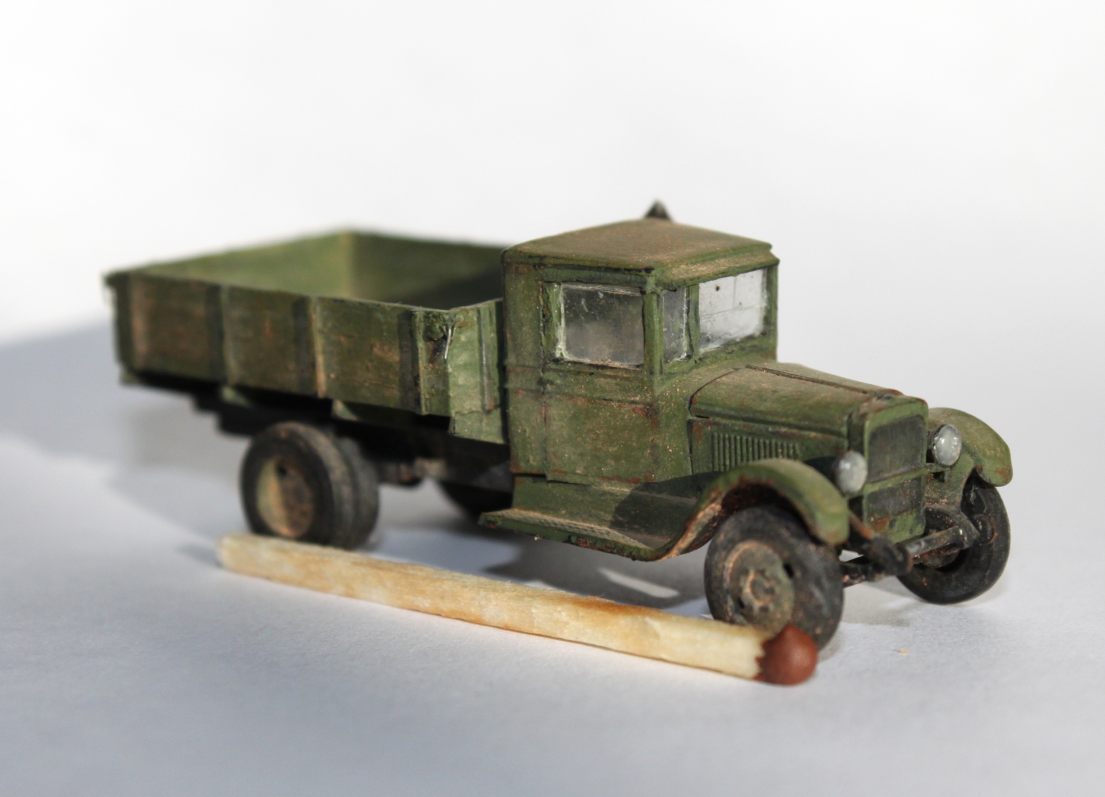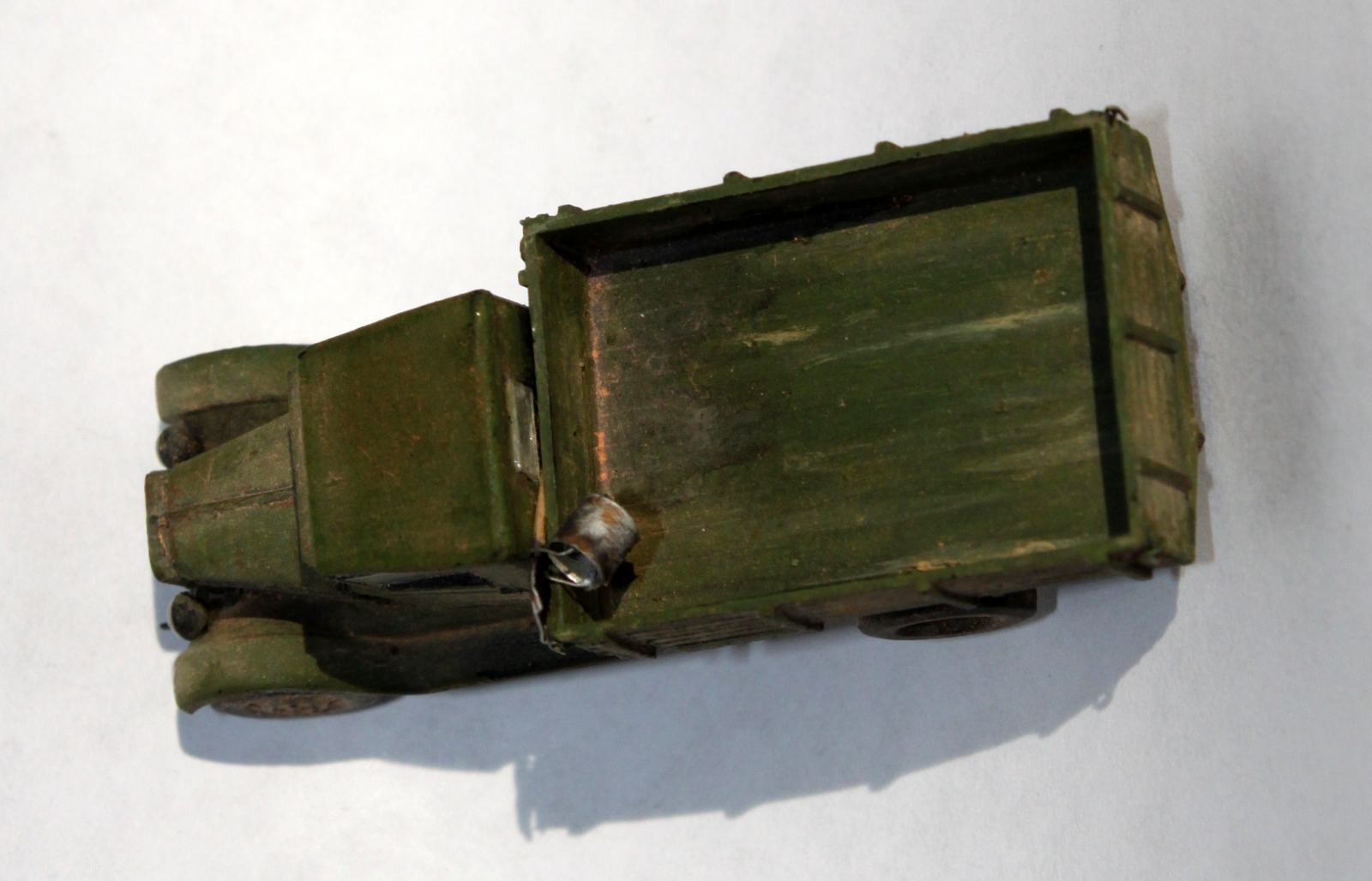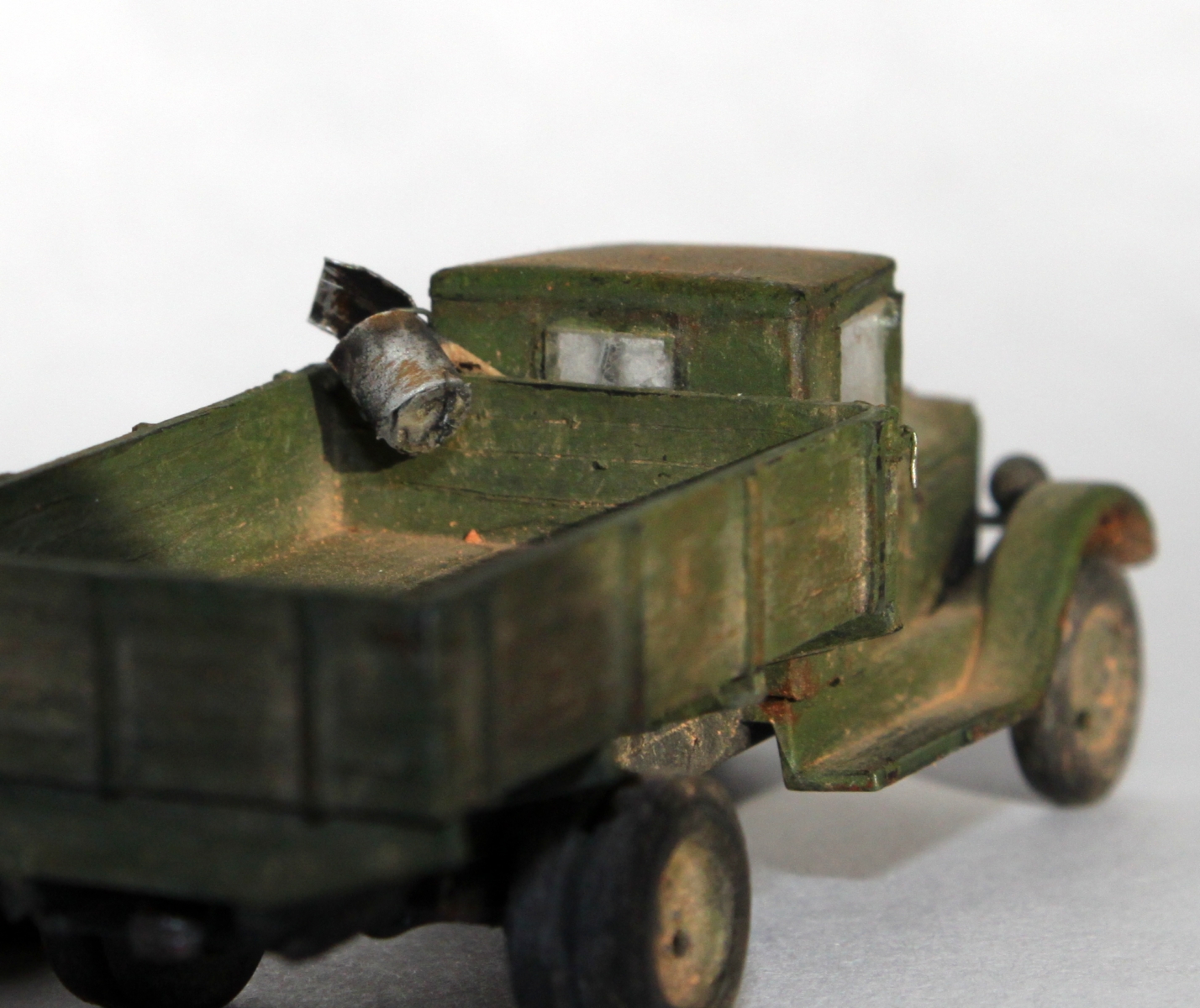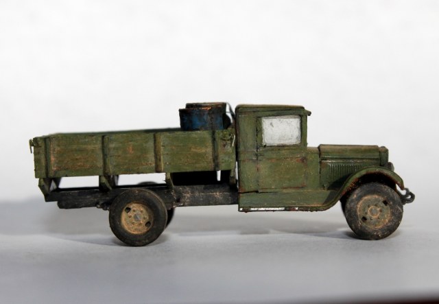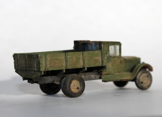 Да, изначально пытался сделать отлично, но чего-то не хватило. Косяков много: капот, колеса, не ровные доски на бортах кузова. Опять-же окраска; нет обозначений, наносившихся на такие автомобили (если честно - побоялся испортить модель). Поэтому, пока, только песочница.