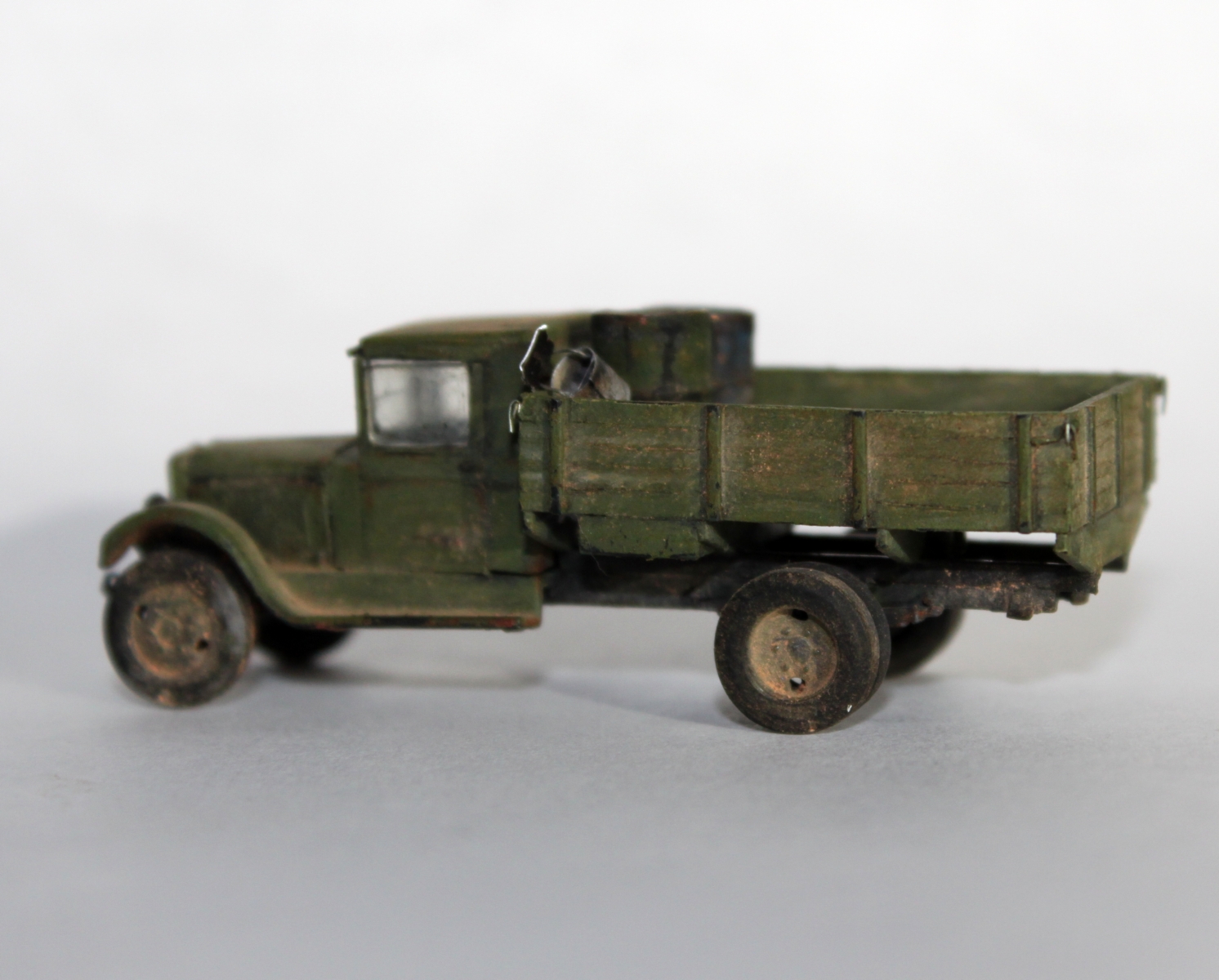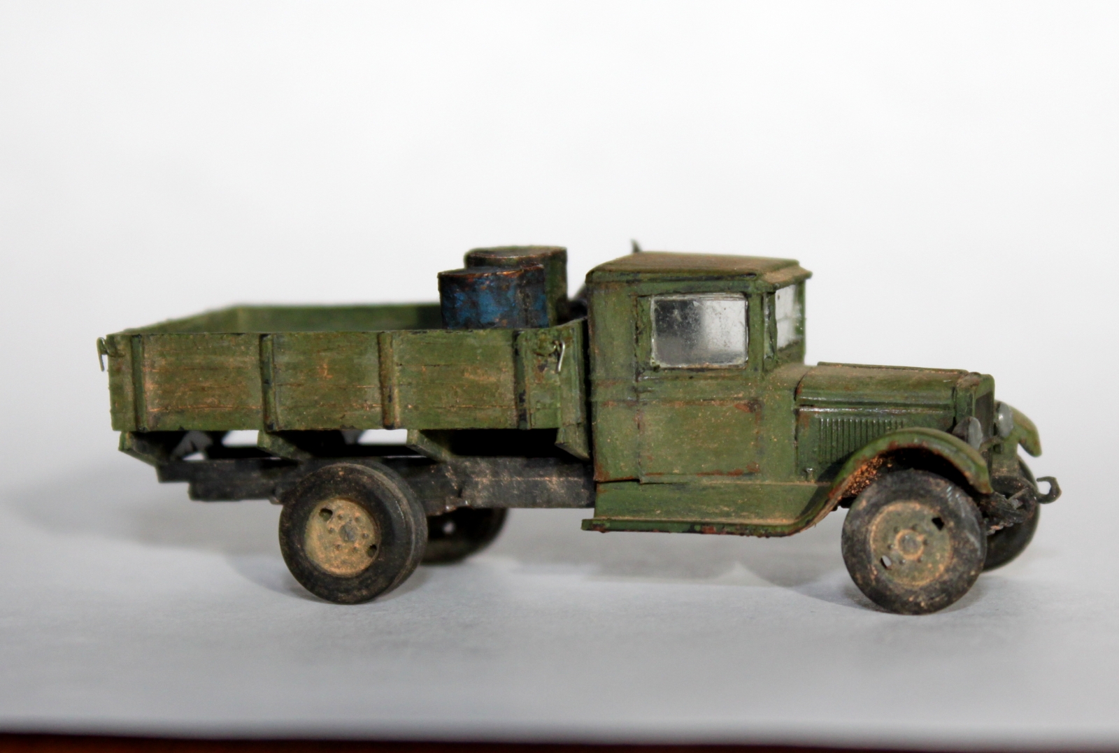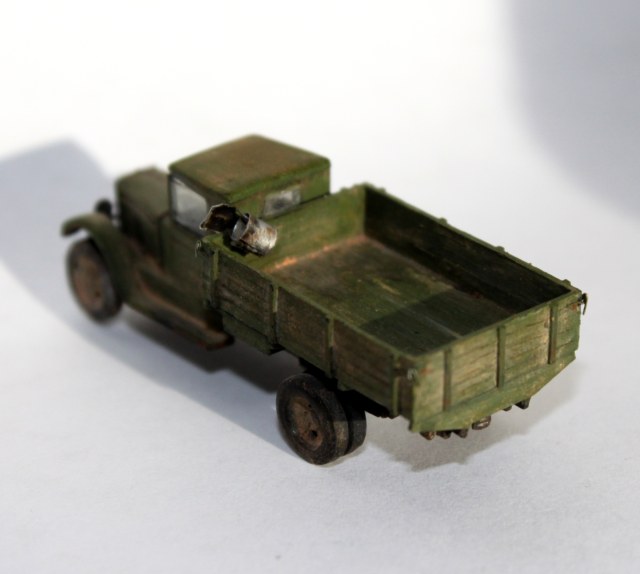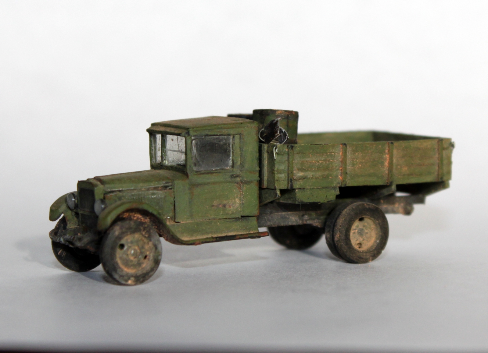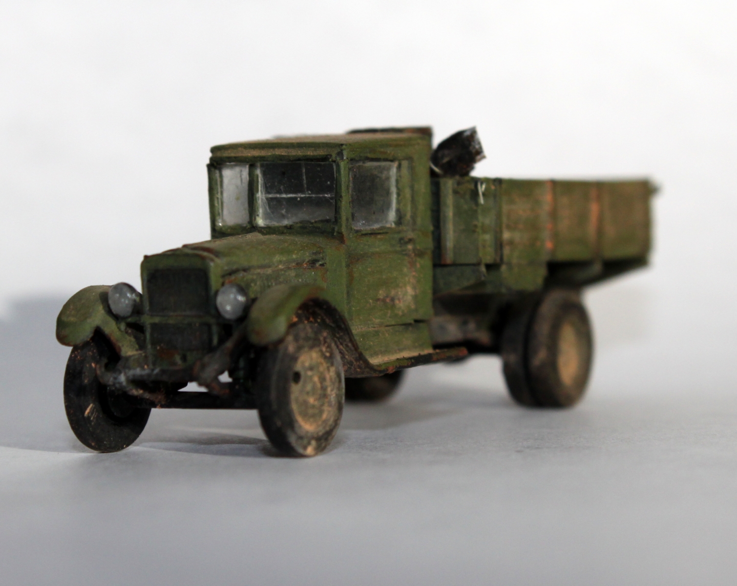 Да, изначально пытался сделать отлично, но чего-то не хватило. Косяков много: капот, колеса, не ровные доски на бортах кузова. Опять-же окраска; нет обозначений, наносившихся на такие автомобили (если честно - побоялся испортить модель). Поэтому, пока, только песочница.