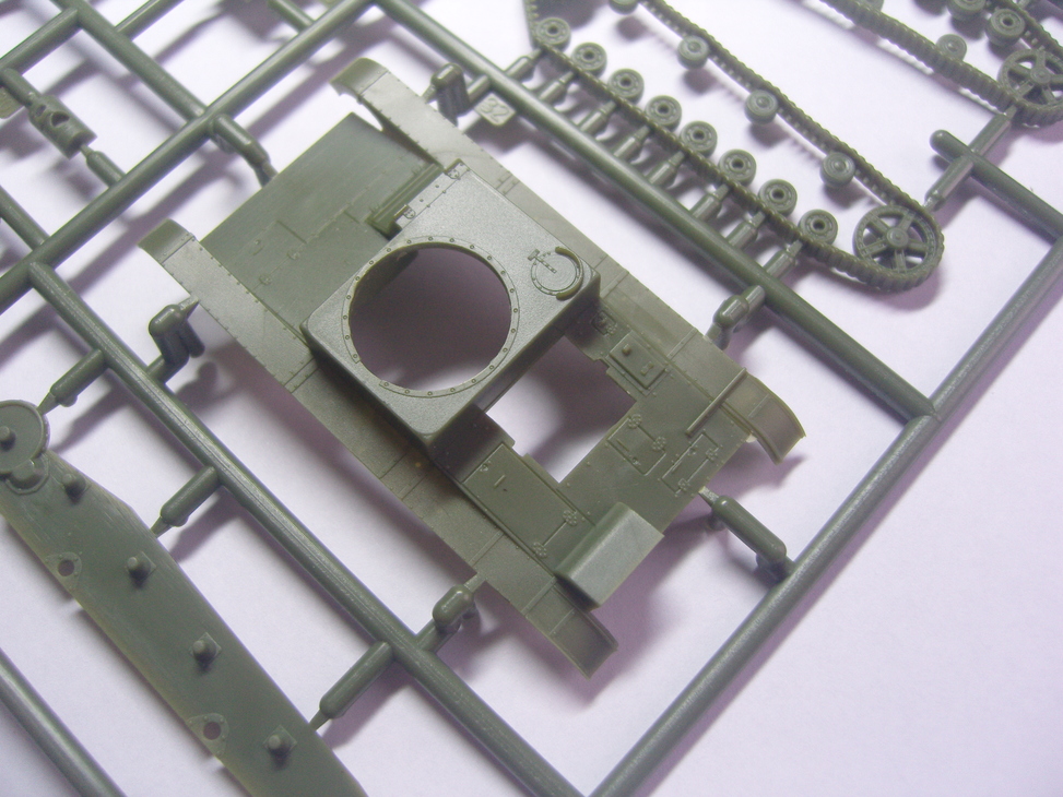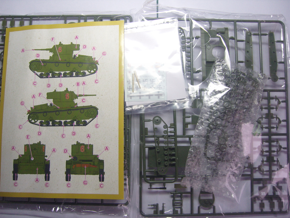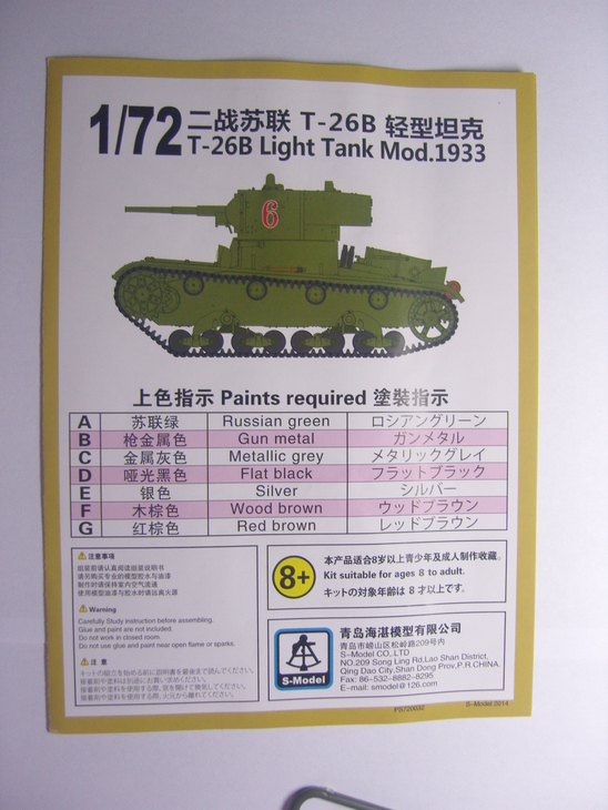 Всем доброго здравия коллеги. Хочу представить вам обзор модели фирмы S-Model. Я никогда не собирал БТТ в блошином масштабе, и вот захотелось попробовать. Т-26 мой любимый образец бронетехники, поэтому выбор пал именно на эту модель, поскольку в комплекте аж целых две модели, одну не жалко будет и запороть. Распечатав сегодня посылку обнаружил небольшую коробочку из не плотного картона. Графика абсолютно не притязательна, схема танка сбоку и на обратной стороне схема окраски. Загрузка боковая. Внутри Большой запечатаный пакет в котором хранится все добро, в наличии - два запечатаных пакета для сборки двух моделей. В каждом из этих пакетов один пакетик пупырчитого (кайфового) полиэтилена с деталями башни и шанца, один запечатанный пакетик с травлом, декалями и двумя точеными стволами. Ну и не большая инструкция по сборке в которой последняя страница дублирует рисунок на коробке со схемой окраски. Изходя из моих знаний танка Т-26 хочу отметить такие особенности. Корпус дан видимо сварной (хотя сварные швы не наблюдаются, как и клеп). Два варианта опорных катков (со сплошной обрезинкой и поздние) Два варианта надмоторной решетки (ребристая и из гнутого листа). Корпус поздний, с дополнительным люком над трансмиссией, выдвинутой рубкой мехвода, общим люком для заправки топливом и маслом. Маска орудия штампованная. Люк мехвода с бронированием петель. Звуковой сигнал тоже поздний прямой, фара с бронировкой. Фар боевого света нету. Крепление буксировочных серьг раннее, не из гнутого листа. Механизм натяжения гусениц отсутствует. Ленивец поздний с оребрением. Сильнее всего не понравилась ходовка, опорные катки должны быть спареные а они сплошные, гусеница вообще на себя не похожа (возможно я придираюсь ибо не работал с таким масштабом и лучше сделать невозможно). Ведущее колесо надо рассверливать. Литьё у модели отличное, утяжин и другого брака не обнаружил. Называется коробочка как T-26B образца 1933, у нас название Т-26 не индексировали - это чисто западная классификация, да и считаю что тут танк больше к 35мо году после модернизации подходит. Как в сборке посмотрим, если поставить на диораму и маленько прикрыть ходовку травой или грязью думаю можно получить отличную модель, к тому же точеные стволы и травло в комплекте. Покупке рад однозначно!