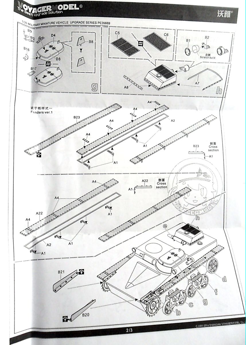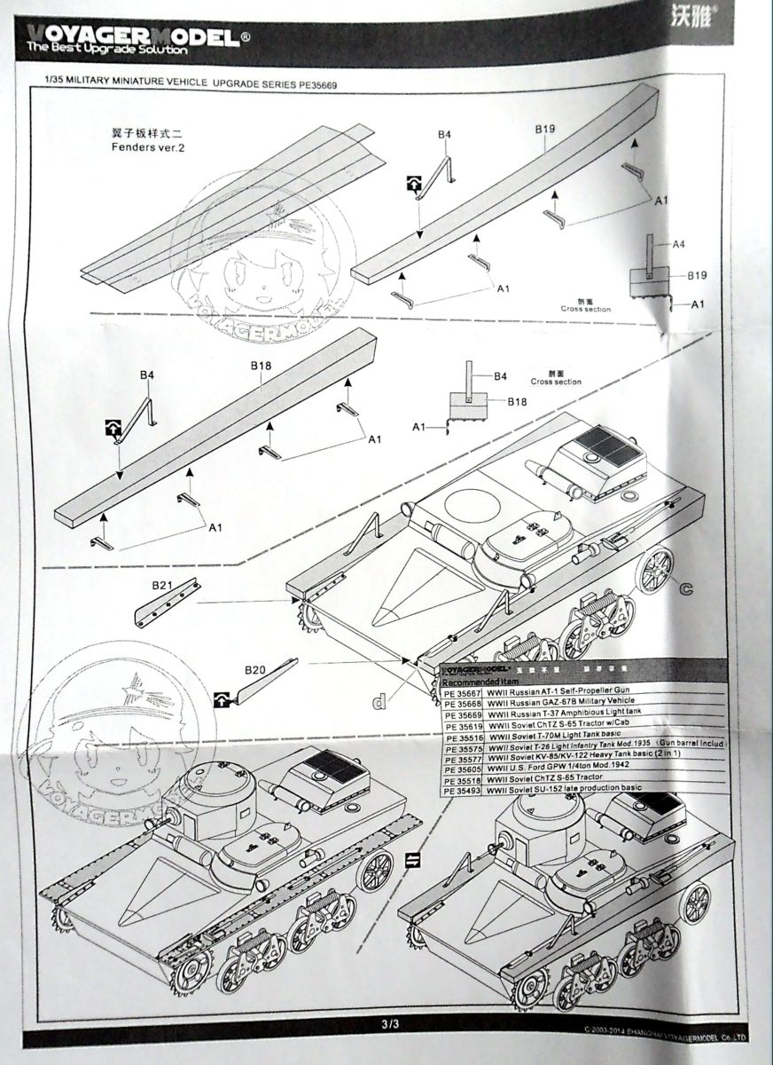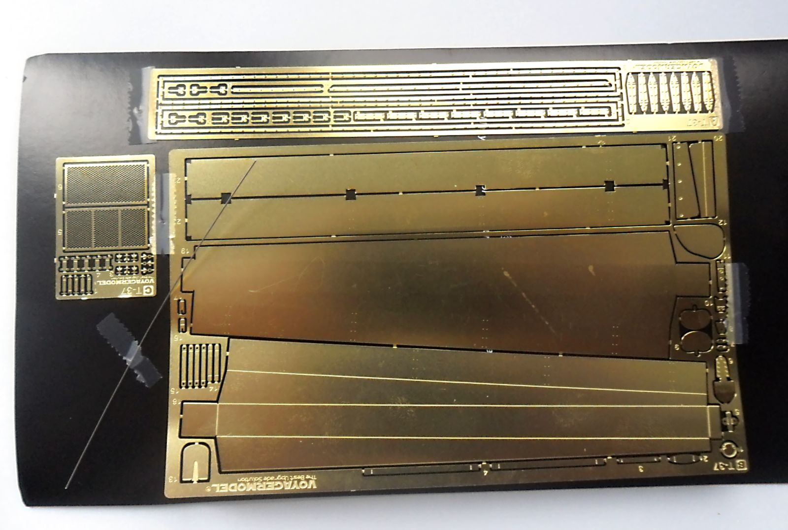 В стандартной "вояджеровской" упаковке находится инструкция и три платы фототравления. Все три платы закреплены на одной картонке: одна большая плата с двумя видами надгусеничных полок (с поплавками и без) и мелкими деталями, вторая платка с двумя видами сетки и мелкими деталями и третья с различными деталями и отбортовками. Ну и еще есть проволочка для изготовления рабочих петель.