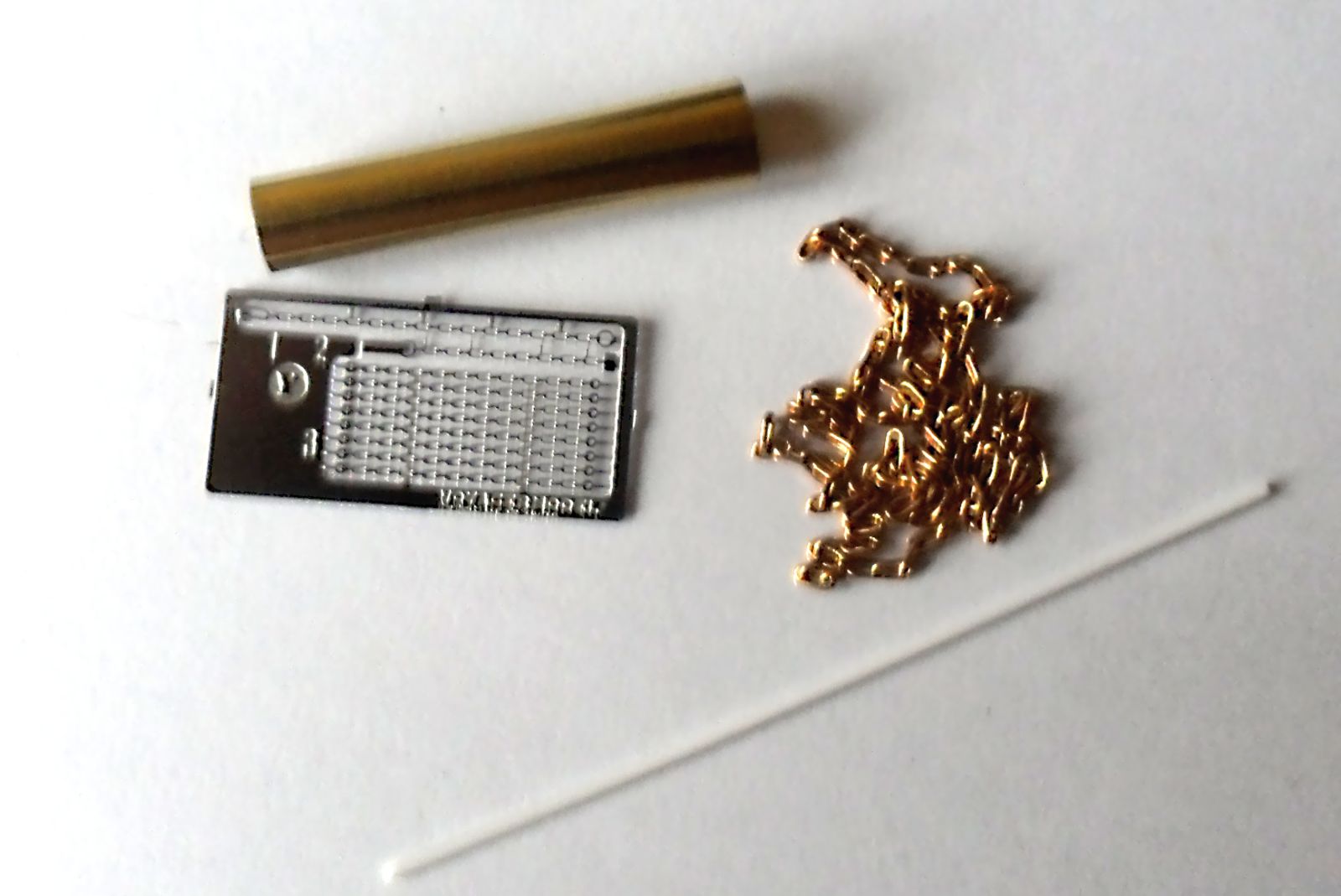 В стандартной упаковке находится инструкция и само травление, закрепленное на картонке. Имеется: большая платка с элементами надгусеничных полок, их крепления и решеткой воздуховода, вторая платка, по-меньше, с деталями для жалюзи, петлями и щитком МВ и совсем маленькая платка с какими-то мелкими деталюшками (я сам не понял для чего, их даже пинцетом взять проблематично), также в наборе имеется трубка для изготовления глушителя, цепь для буксировки и проволочка для изготовления петель. Хотя для чего делать на модели рабочие петли, непонятно - у модели полностью отсутствуют внутренности))))