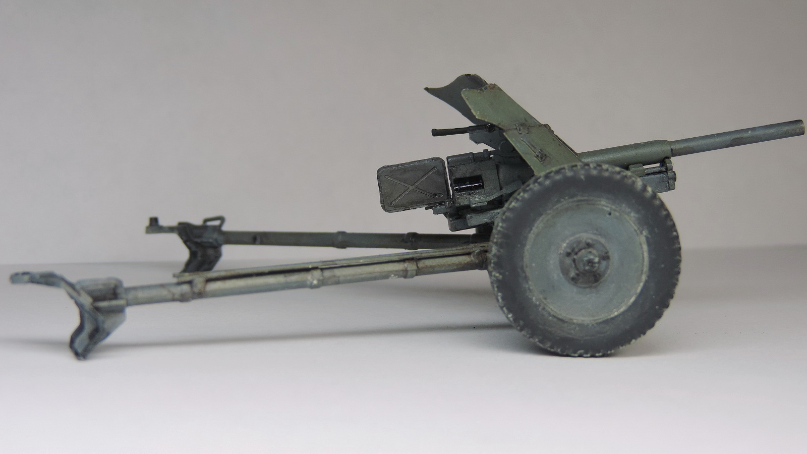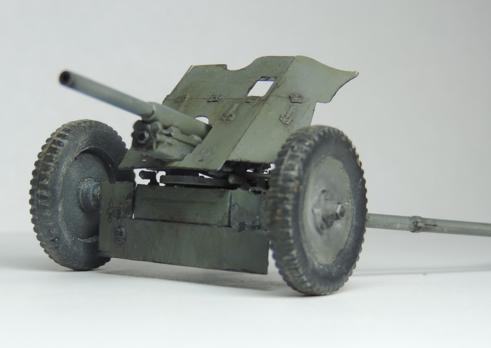 Я бы добавил в описание, что орудие выпуска до 1940 года, так как ствол сборный. Упоры для откидной части щита чаще всего были отогнуты, хотя можно и так оставить. По шинам уже сказано что надо бы зашкурить плюс не хватает пять продольных канавок. На сошке должны быть две секции банника и окрашены в дерево. Вообще сам набор лучший из подобных при желании можно было бы замутить диораму, тут подобные есть уже с замечаниями..)