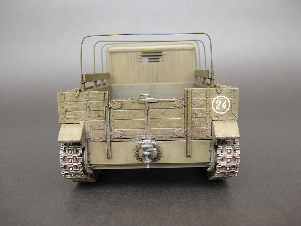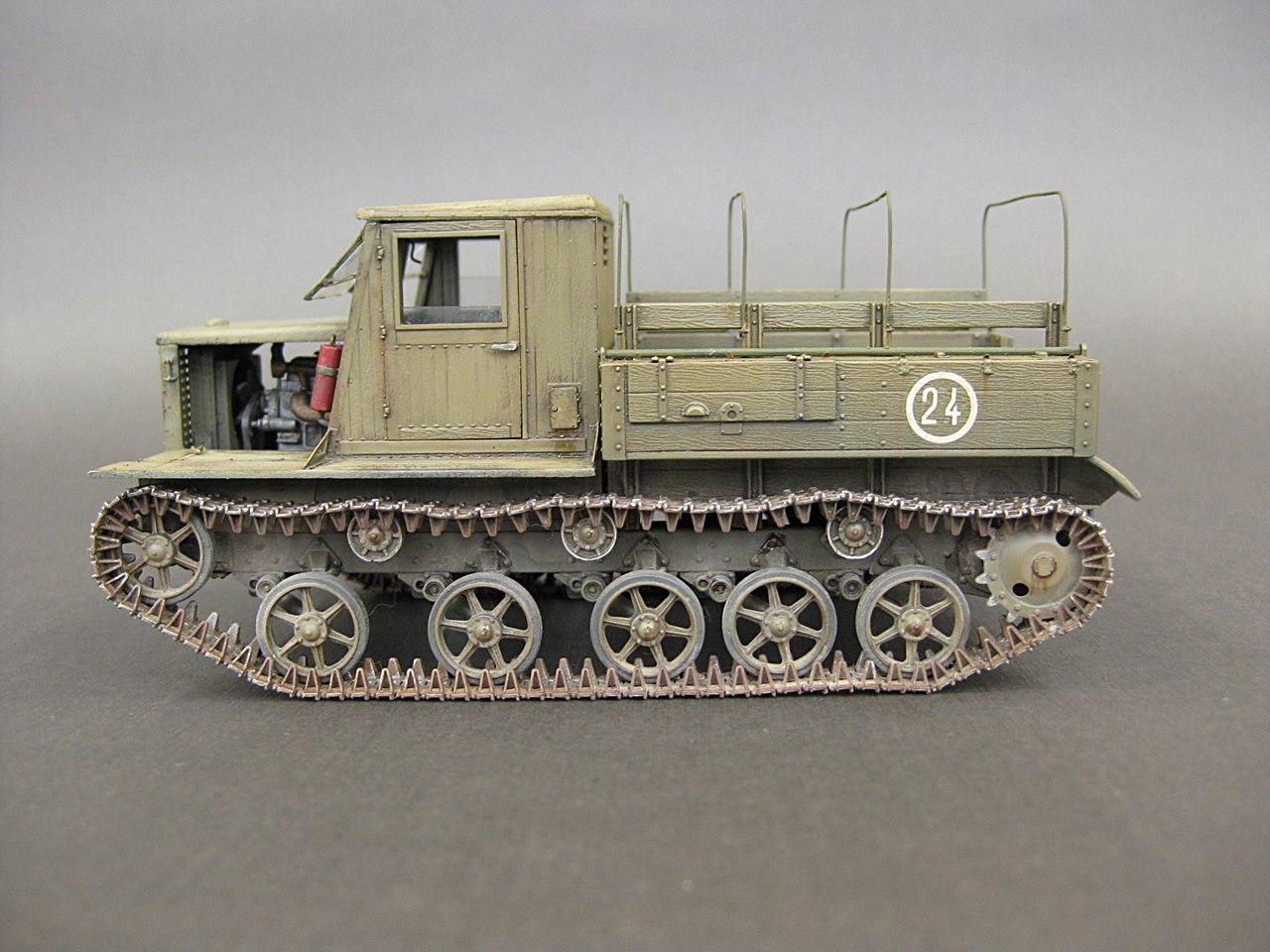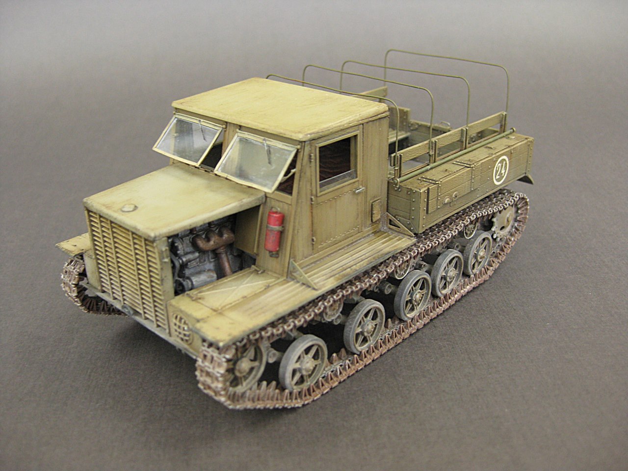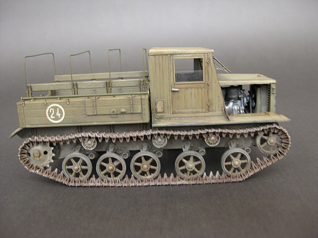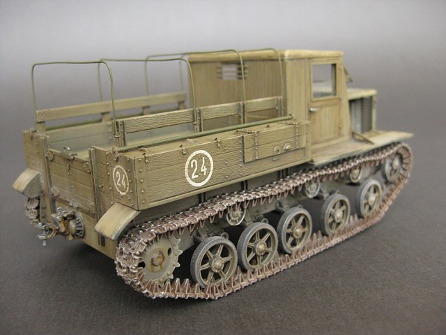 - Добрый день.Моя очередная работа.Сборка прошла без проблем.Только сборка траков не понравилась-большинство ломались при сборке,пришлось склеивать.Из доработак-заменил дуги тента на провочные.А так набор очень аккуратный и приятный в работе.