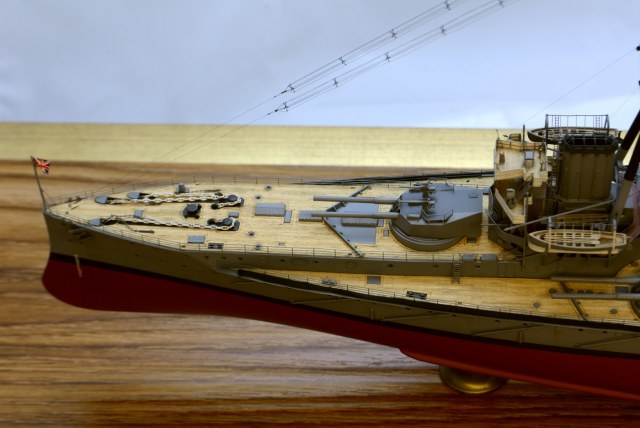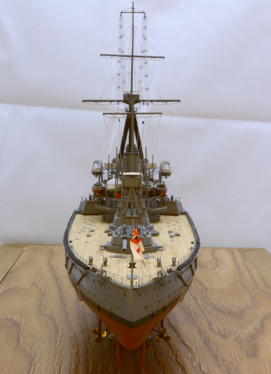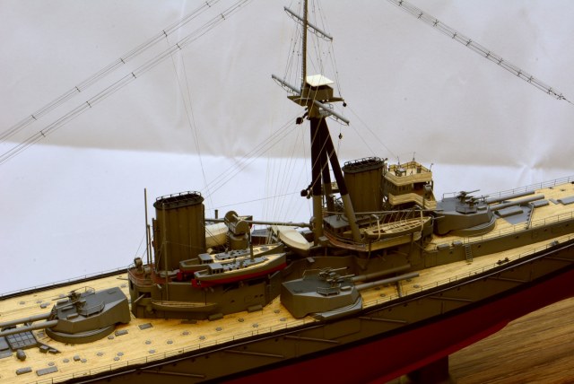 Александр, отличная модель вышла! Такелаж - выше всяческих похвал! Не совсем понял, почему нет прохода в леерах на полубаке над трапами по бокам от передней башни ГК. И якорь-цепь разве может быть белая?