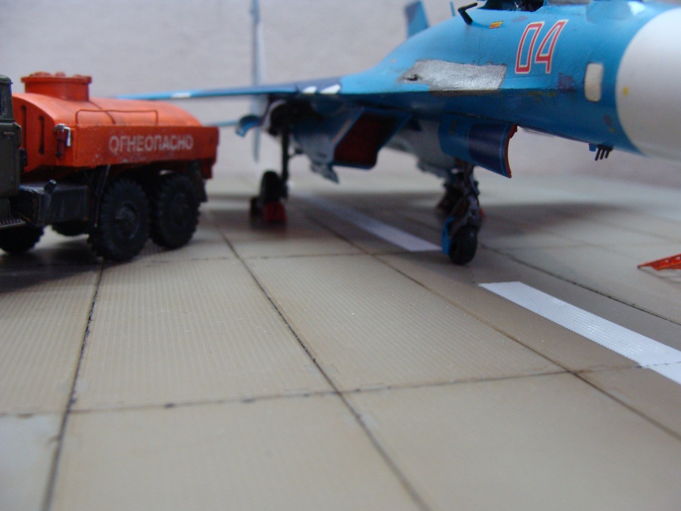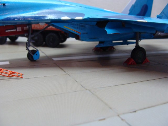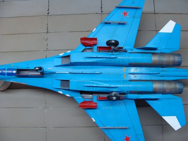 Представленный мною борт находится в Липецком центре. И по моему субъективному мнению в этом центре за техникой "ухаживают". Так же на представленных мною выше фото видно что днище этого борта чистое. Да впрочем и весь самолет чистый. Я так и пытался сделать, выделить местами крой, где он на реальном борту виден. Очень я люблю пачкать модели, мой Миг-25 этому подтверждение, а здесь самолет реально чистый. По поводу колес, согласен, на фото есть блеск. Покрывал в 2 слоя матовым лаком Акан, вот такая матовость получилась.