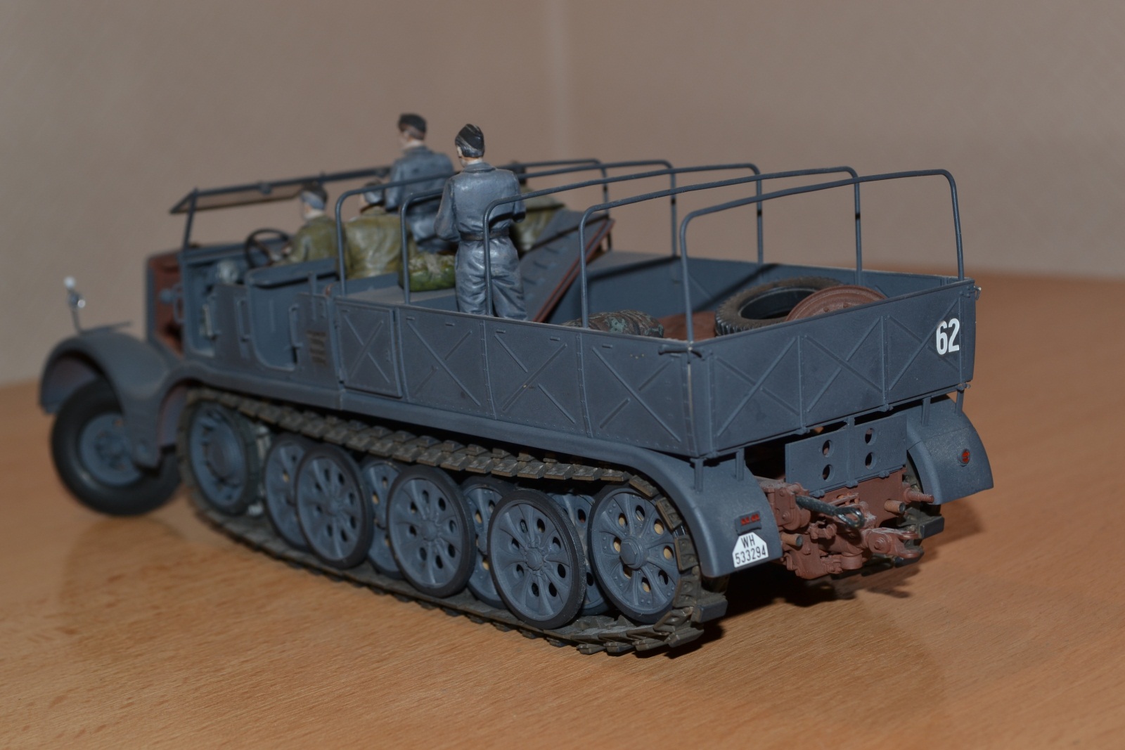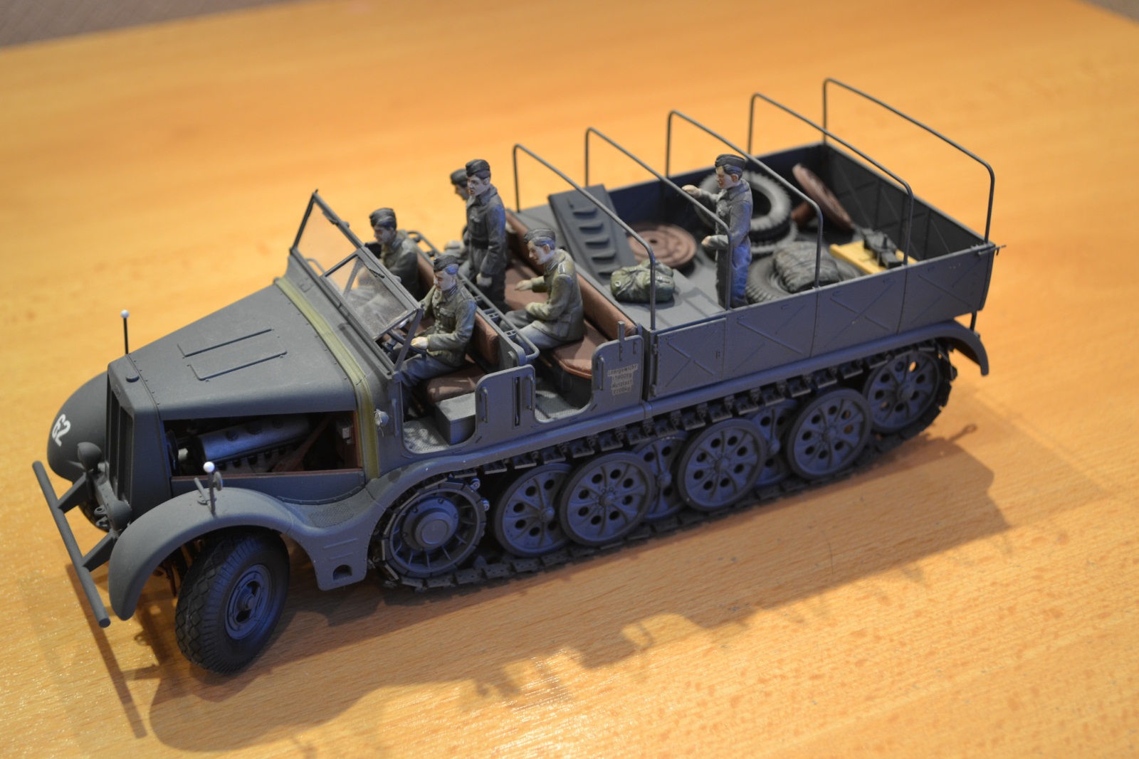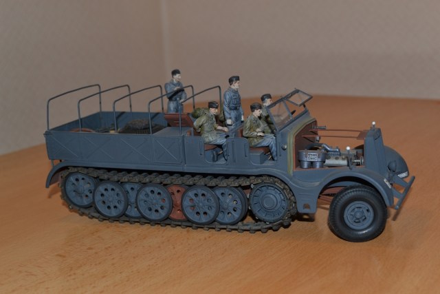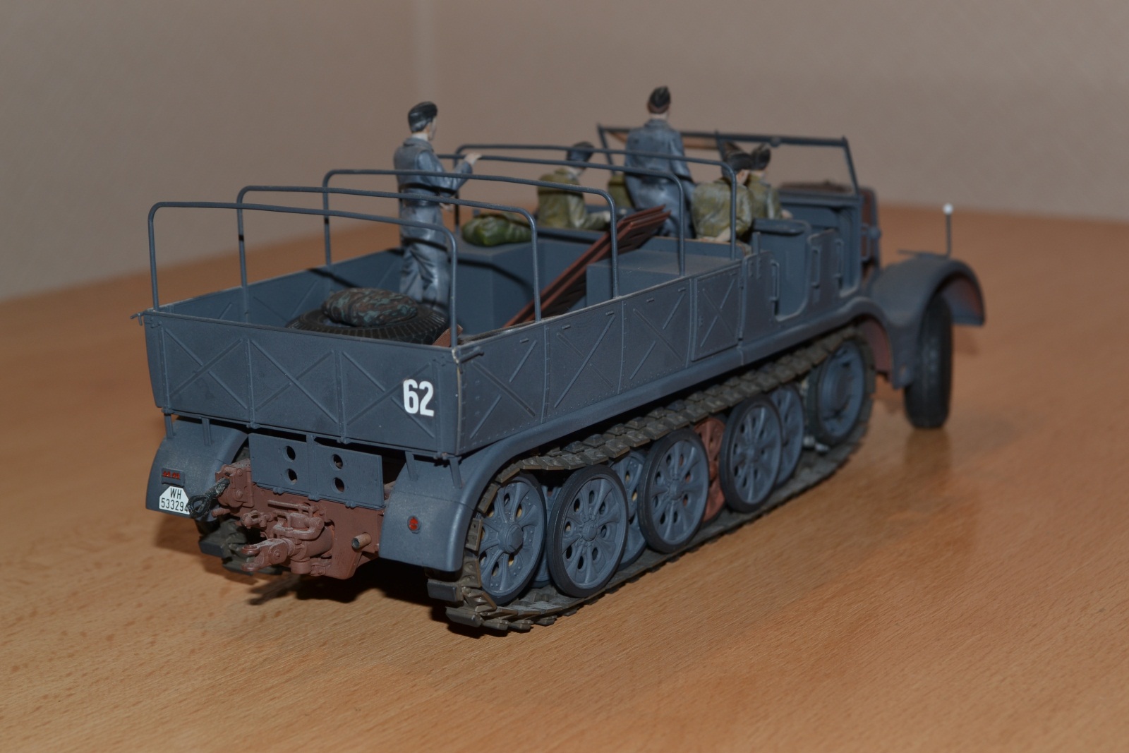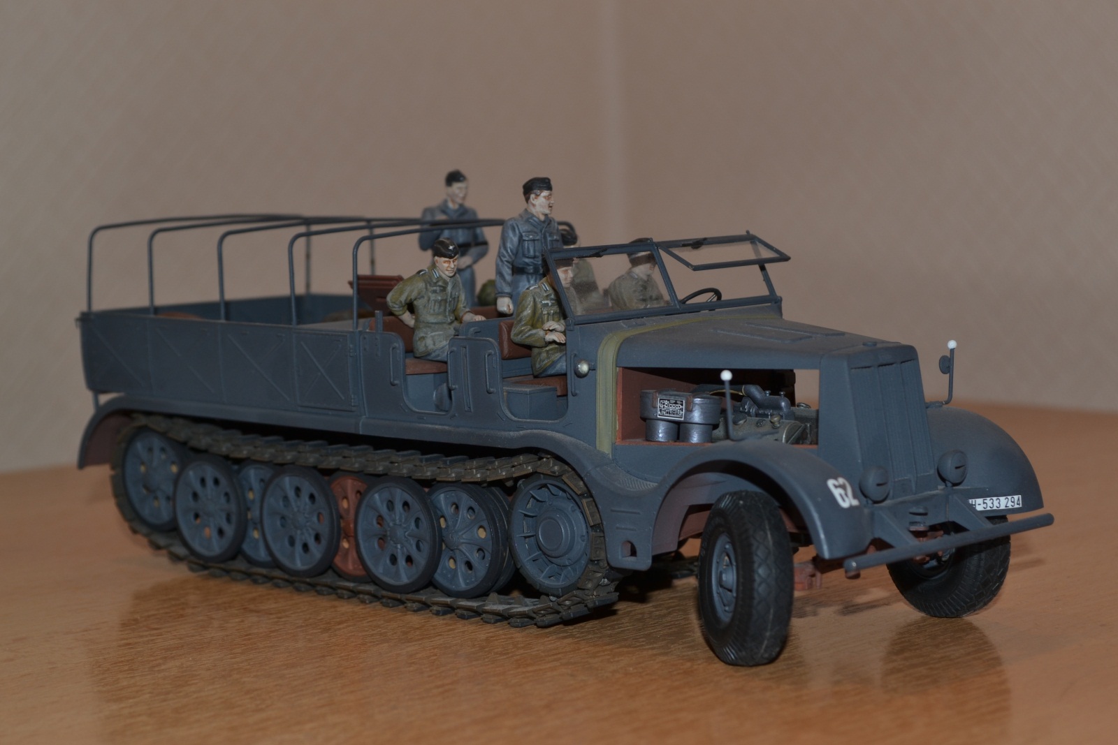 Представляю вашему вниманию модель крупнейшего полугусеничника Вермахта – FamoSd.Kfz.9. Полугусеничник с силой тяги в 18т мог с легкостью отбуксировать любой образец БТТ вплоть до Т-4 и перевозить при этом до 3 т. груза. На буксировку более тяжелых Пантер и Тигров требовалась упряжка от 2 до 4 таких машин, вот почему их роль как эвакуаторов после 1943 года стала падать. Машина выпускалась в 5 различных вариантах: