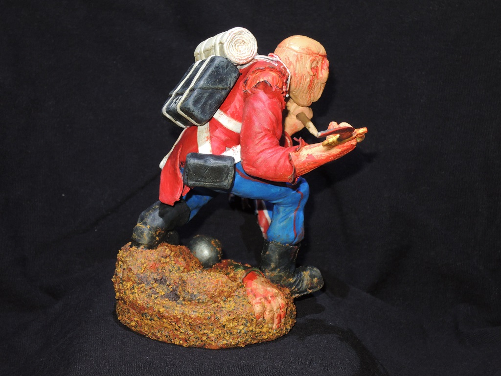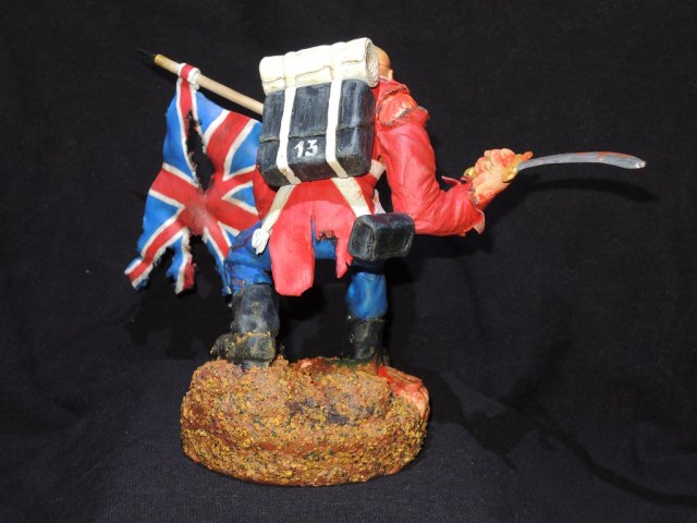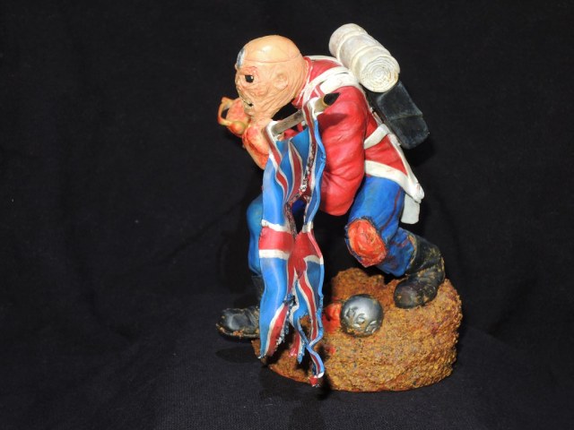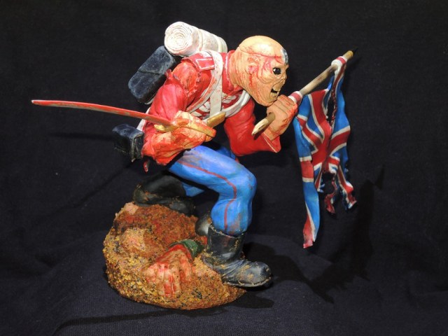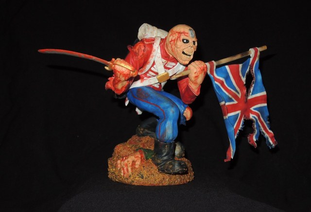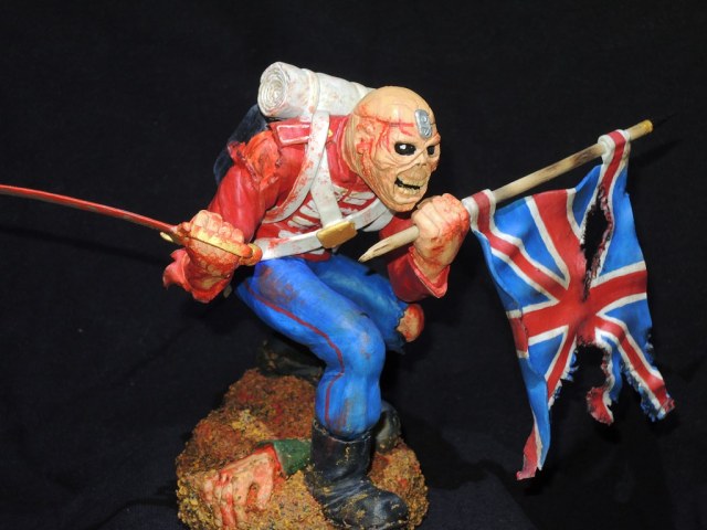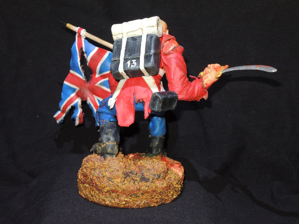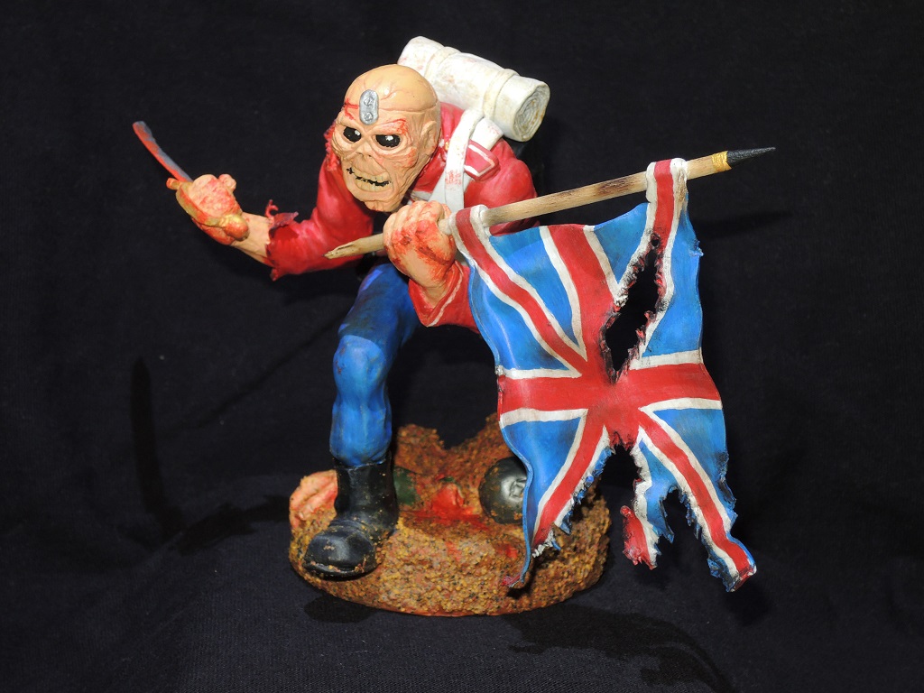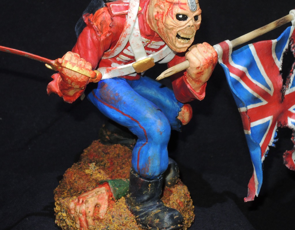 Теперь по работе. Сама модель очень не плоха, и вполне похожа на обложку сингла. Кисть с саблей, сильно вывернута вправо, сама сабля, не очень удалась, она коротковата, да и форма клинка немного не такая, как в оригинале. Посадка фигуры, слишком глубокая, на обложке, Эдди стоит немного выше. Флаг и древко, получились просто отлично. Подставка не очень удалась. Под ногами фигурки, какая-то цветная каша.