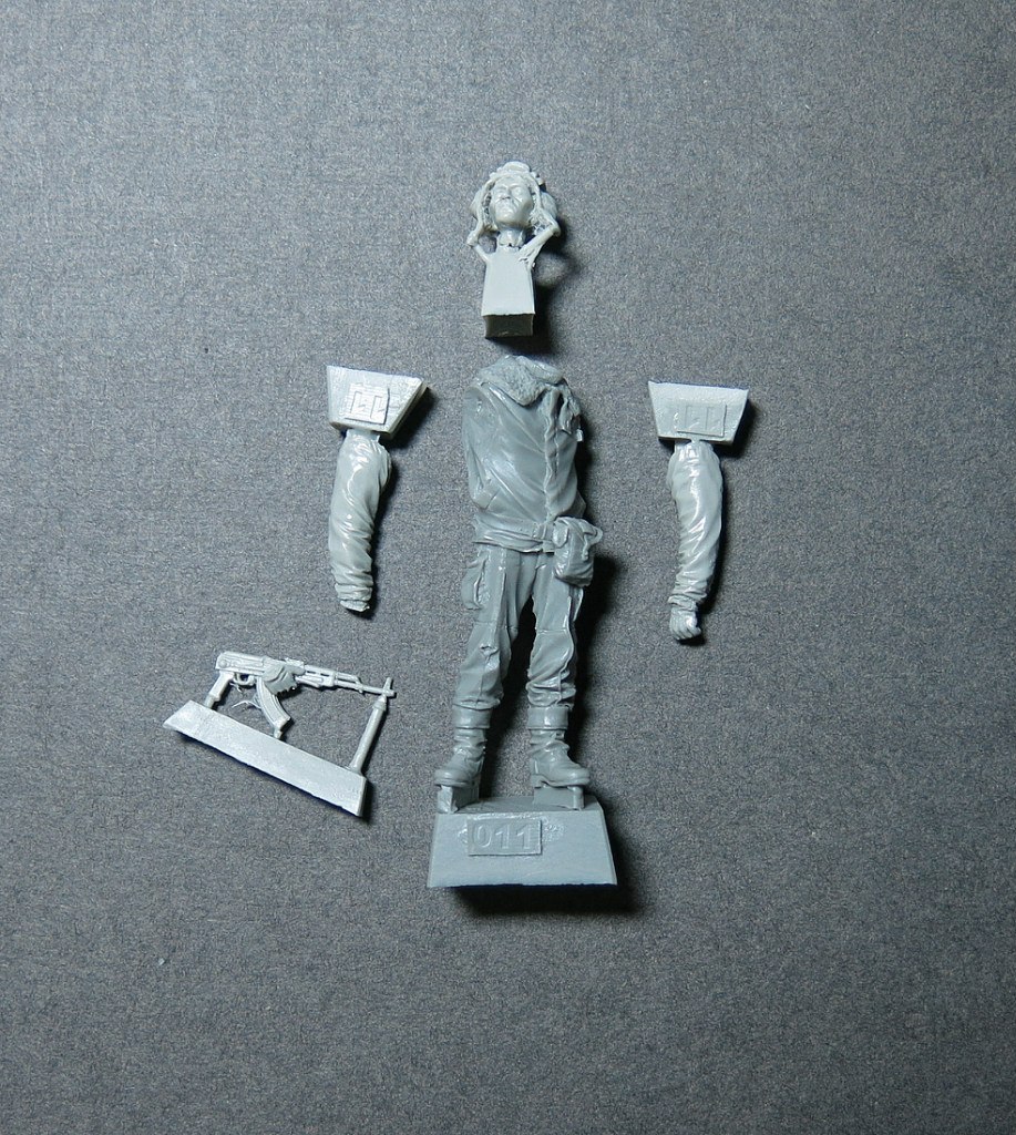 Фигура (за каталожным номером EM-35011) упакована в стандартную для Evolution коробку из мягкого и тонкого картона, в которой, в двух зип-паках, "смягченных" "пупырчатой упаковкой" находятся 5 смоляных деталей, включающих в себя туловище, две руки, голову и оружие, для сборки одной фигуры Российского танкиста времен Чеченских компаний.