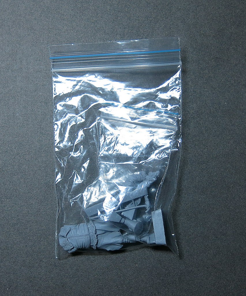 Фигура (за каталожным номером EM-35078) упакована в стандартную для Evolution коробку из мягкого и тонкого картона, в которой, в двух зип-паках, "смягченных" "пупырчатой упаковкой" находятся 5 смоляных деталей, включающих в себя туловище, две руки, голову и трость, для сборки одной фигуры Советского офицера в поздний период ВМВ.
