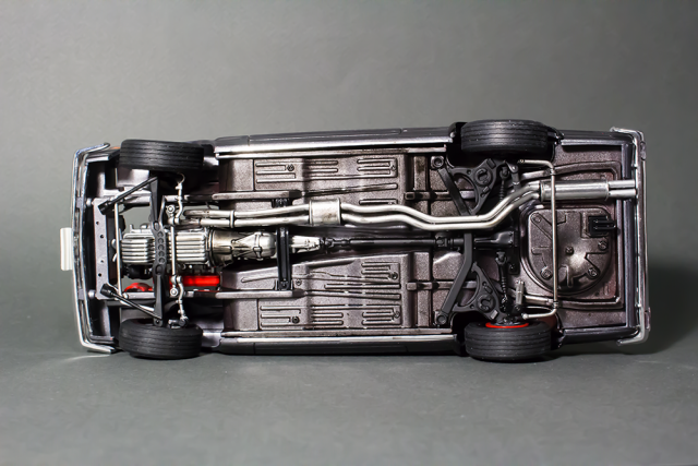 Теперь по модели. Модель понравилась едва я открыл коробку с китом. Собиралась на одном дыхании, без осложнений. Цвет кузова окрашен в тамиевский TS-38 Gun Metal, лак художественный Crylon, полироль финишная тоже тамия. За неимением BMF применил аллюминиевую клейкую ленту для уплотнителей стёкол. Проводка в подкапотном отделении получилась немного толстоватой, т.к. более тонких проводков не нашёл. Учитывая что проводку я делал впервые, считаю что получился не самый ужасный вариант. Родные японские номера заменил на американские. Наклеил пару декалек (радиаторная решётка, боковое стекло, лобовое и заднее стекло, под задним фонарём).