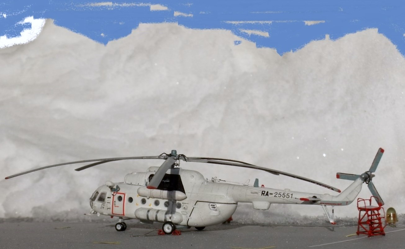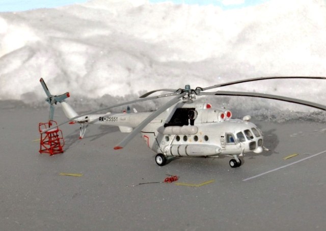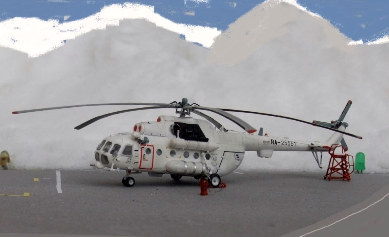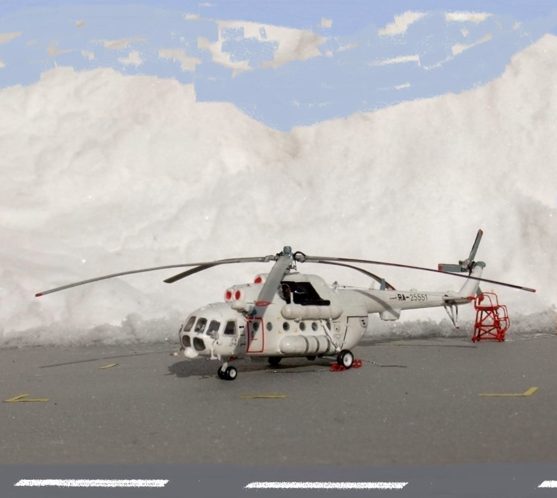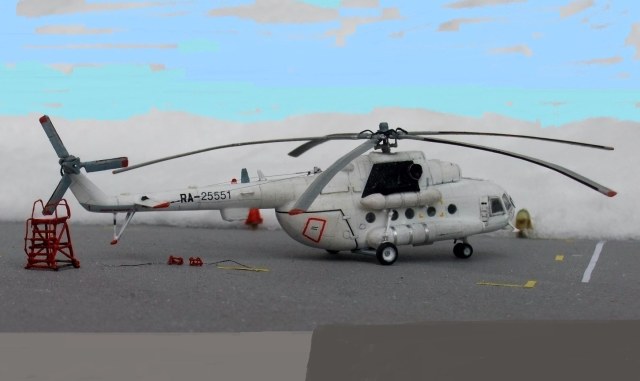 Всеми знаменитая вертушка МИ-8 думаю в техническом описании не нуждается, борт №25551 Utair-овских авиалиний под маркой ми-8тв, не хотелось делать аэрофлотовскую ливрею, долго думав остановился на этом борту приблизив его к реальному времени, декали в наборе были аэрофлот ссср, поэтому номера, и прочие нанесения от остатков старых дек.