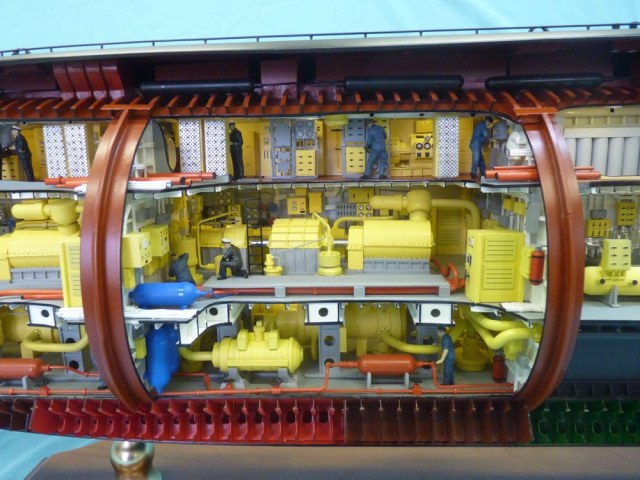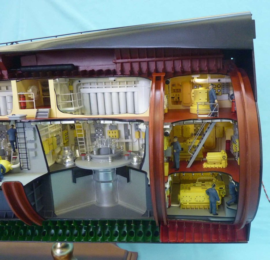 Это наш ответ американцам на их «Джордж Вашингтон». Модель выполнена в 50 масштабе с внутренней подсветкой отсеков, как и все предидущие проекты подводных лодок в разрезе. Строилась модель два года по частям (нос, корма) руками 6 человек, плюс сбор информации и фотографий примерно 4 месяца. Модель очень большая – 2700мм. Поэтому было принято решение делать из двух частей. Иначе её не вынести из кабинета, ни перевезти. Окончательная стыковка производилась у заказчика. Процесс изготовления подробно описывать не буду, практически всё есть на фото. Сам корпус выклеен из стеклопластика. Материалы использовались от пластика и оргстекла до металла, бумаги и канализационных труб (новых) J. Фигурки матросов перетачивались