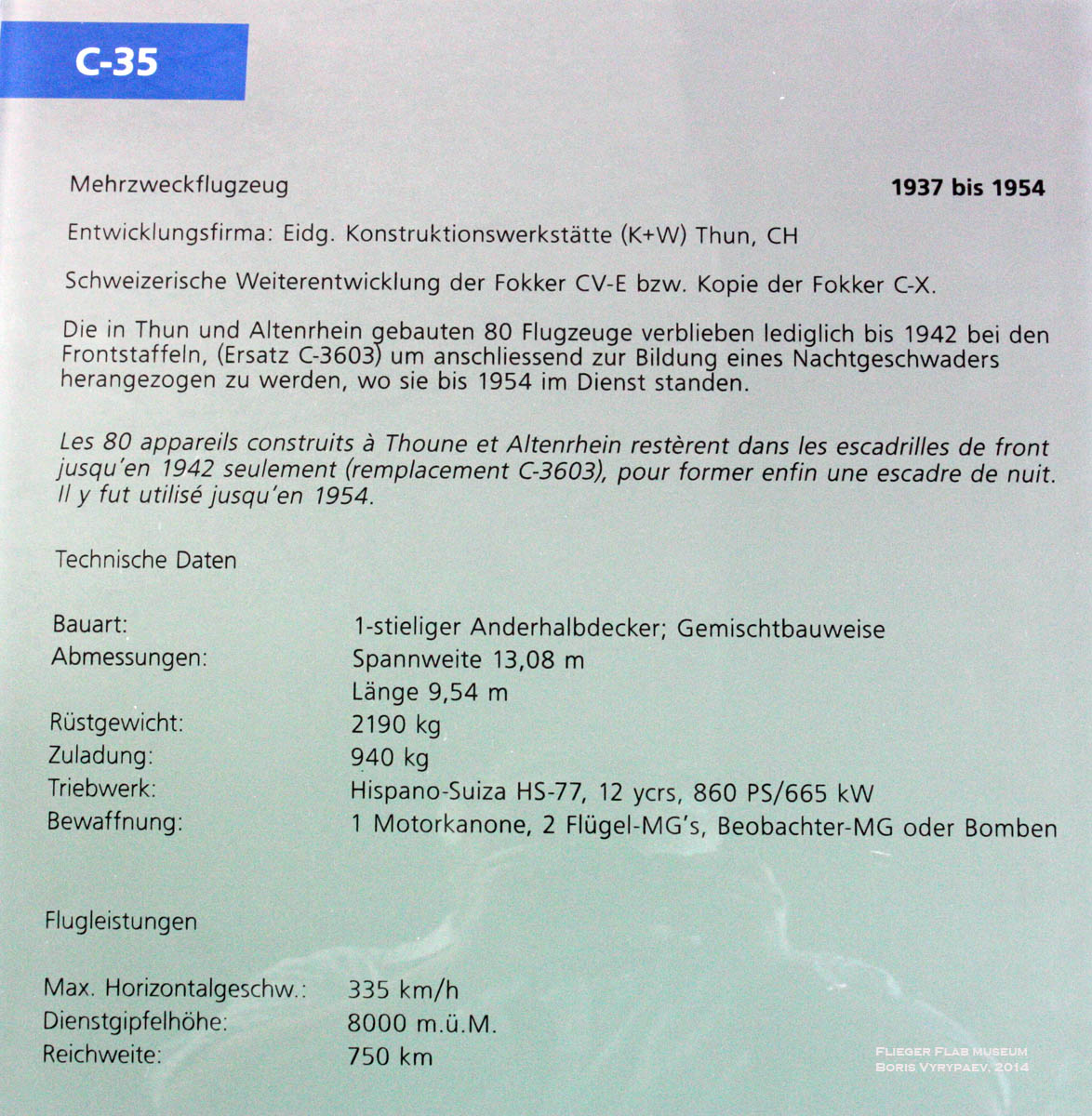 Назначение самолёта, названного С-35, не сильно отличалось от голландского - швейцарский вариант должен был выполнять функции тяжелого истребителя, ближнего разведчика и самолёта непосредственной поддержки войск. Благо, ТТХ С-35 заметно выросли - максимальная скорость составила 335 км\ч, потолок - 8000 метров. В этом отношении самолёт был схож с новейшим представителем семейства "Фоккер"— самолетом Fokker С.X.