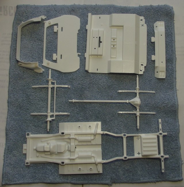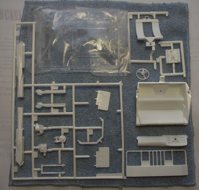 Предусмотрен открывающийся капот, под которым некоторая имитация ГБЦ и другого оборудования. Салон - ванна, вместе с сиденьем-диваном, и приборная панель с приборами , НО БЕЗ декалей! Вся светотехника отлита заодно с другими деталями (ещё один пункт для доработок).