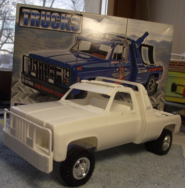За полчаса (просто сняв с литников детали) я соорудил общий вид этого трака. Попыхтеть, конечно, есть над чем! Но, даже если его просто собрать и аккуратно покрасить, то можно получить вполне сносный экземпляр. Только колёса (мне лично) показались маловаты! Или рессоры сильно выгнуты...