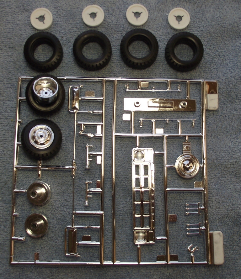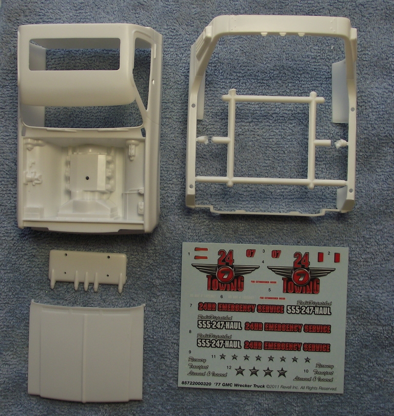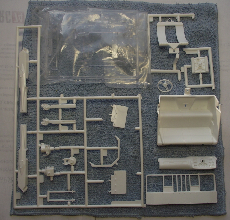 Итак, перед нами представитель эвакуаторов из семейства моделей, основывающихся на этой базе. В коробке пять небольших литников с деталями из белого пластика, хромированными деталями и прозрачными деталями (для остекления и мигалок). Кабина и задняя надстройка даны отдельными деталями. Пластик чистого белого цвета, без разводов и утяжин, достаточно жёсткий, но есть следы от толкателей, которые надо будет обрабатывать. Есть немного некритичного облоя на некоторых деталях. В целом, общее впечатление вполне приятное (посмотрим, как в работе...). Колёса (покрышки) цельнолитые из резиноподобного пластика, достаточно мягкие. Небольшой листик декалей с надписями и имитацией указателей поворотов.