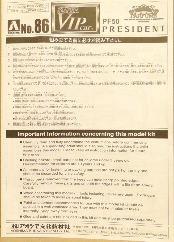 Приветствую Вас уважаемые Коропчане. Представляю Вашему вниманию творение фирмы AOSHIMAавтомобиль NISSANPF50 PRESIDENT. В коробке имеется понятная и подробная инструкция по сборке модели, салон автомобиля, днише, 8 литников чёрного цвета, листочек декали, листочек нождачной бумаги, довольно грубой, 5 литников хром, резина и 3 литника прозрачных деталей. Всё это дело запаяно в пакетики и аккуратно уложено. При осмотре облоя и прочих косяков, которые могут испортить настроение, не обнаружено! В данном исполнении нам представили выхлопную систему вылитую в целом с днищем и отсутствие двигателя, только картер. Капот не открывающийся, зато имеется два варианта передних сиденьев ( для чего, не понятно). Детализация салона средненькая, но не убогая, имеются даже на ванночке остекленения на крыше солнцезащитные козырьки и подсветка салона. В целом набор нормальный, стоит того, чтоб приложить к нему очумелые ручки. Всем спасибо за внимание. Приятного просмотра.