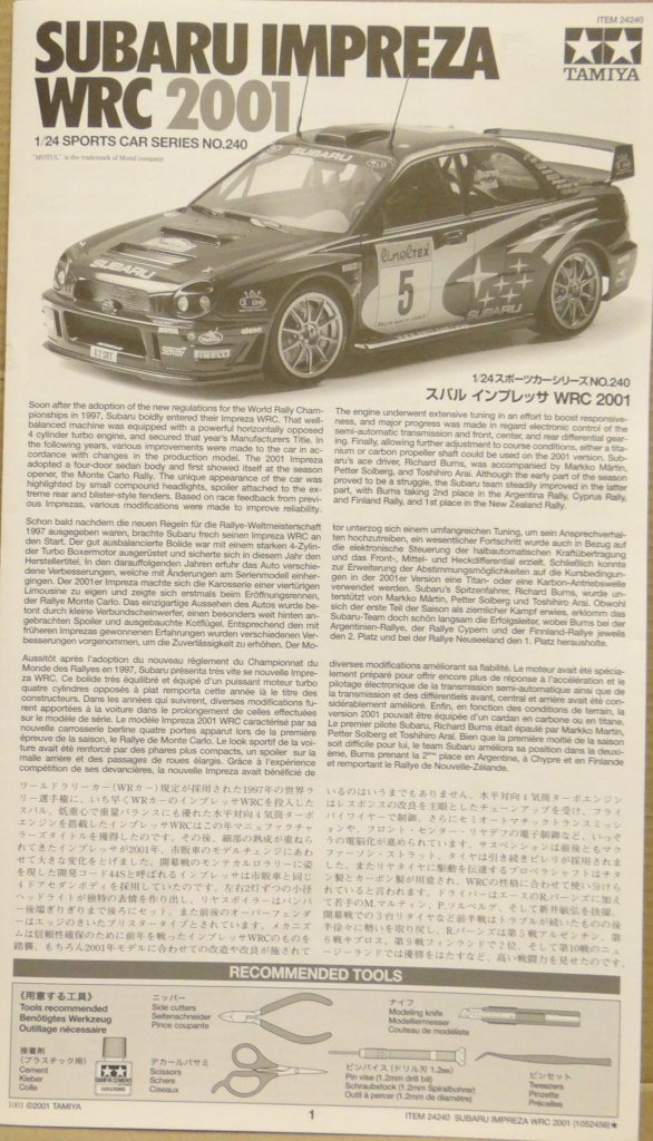 Приветствую Вас уважаемые Коропчане. Представляю Вашему вниманию творение фирмы TAMIYAавтомобиль SUBARUIMPREZAWRC 2001. В коробке имеется понятная и подробная инструкция по сборке модели, салон автомобиля, днише, 6 литников с деталями синего, серого и чёрного цвета, 2 листа декалей, резина и 3 литника прозрачных деталей. Всё это дело запаяно в пакетики и аккуратно уложено. При осмотре облоя и прочих косяков, которые могут испортить настроение, не обнаружено! В целом набор нормальный, стоит того, чтоб приложить к нему очумелые ручки. Всем спасибо за внимание. Приятного просмотра.