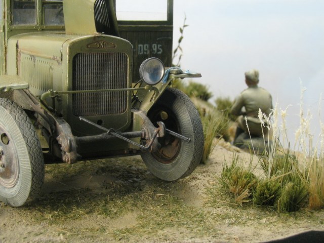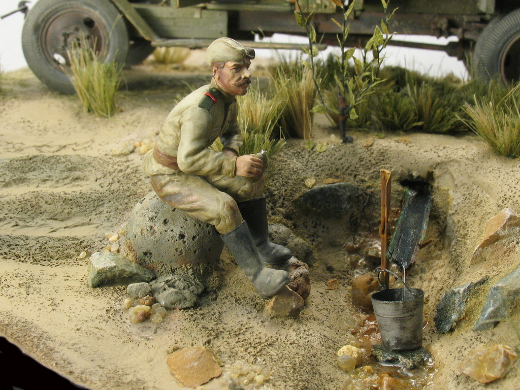 По диораме: конец лета 1943 года, степь, небольшая засуха, водитель съехал с дороги к родничку, за которым посильно ухаживают, набрать воды в радиатор, самому напиться. Водичка течет еле-еле, сел водитель на камень, да призадумался.