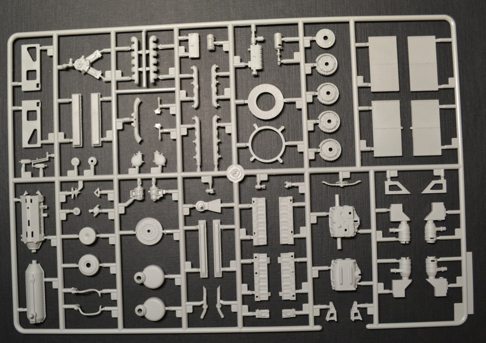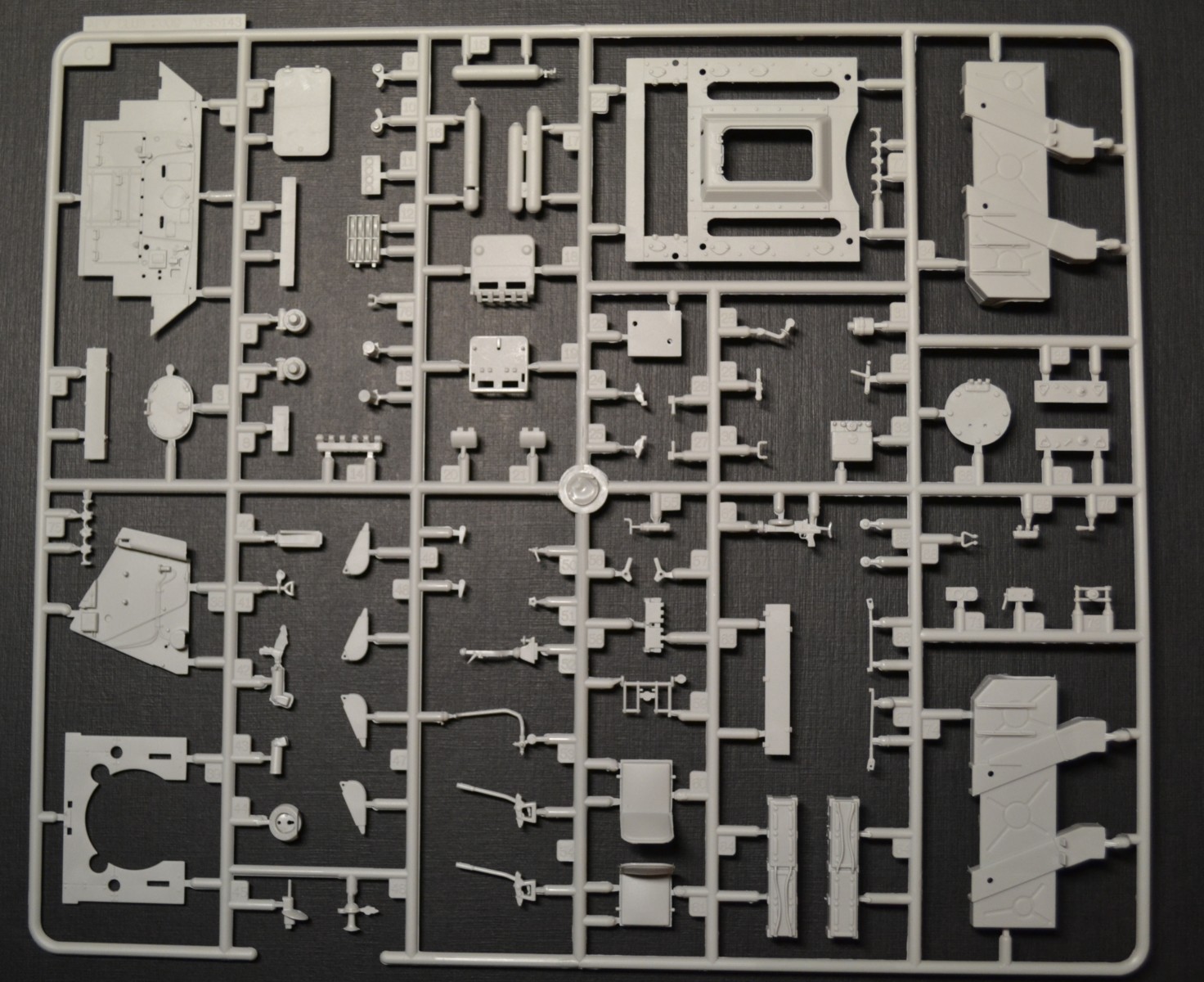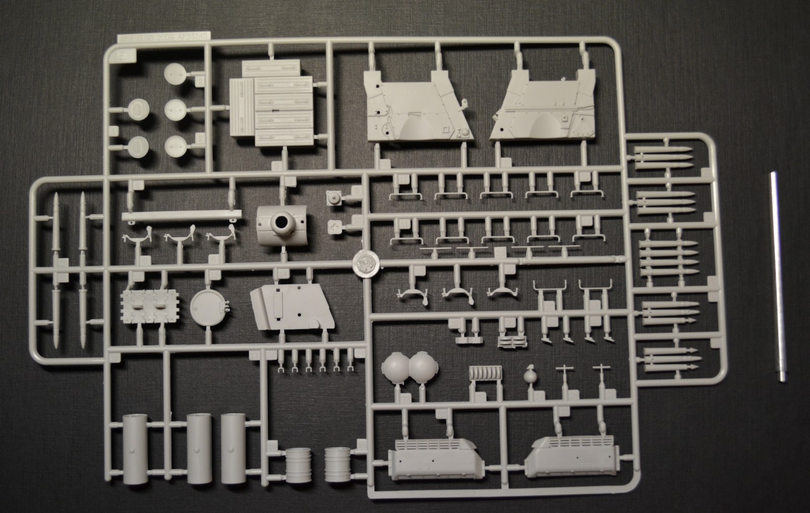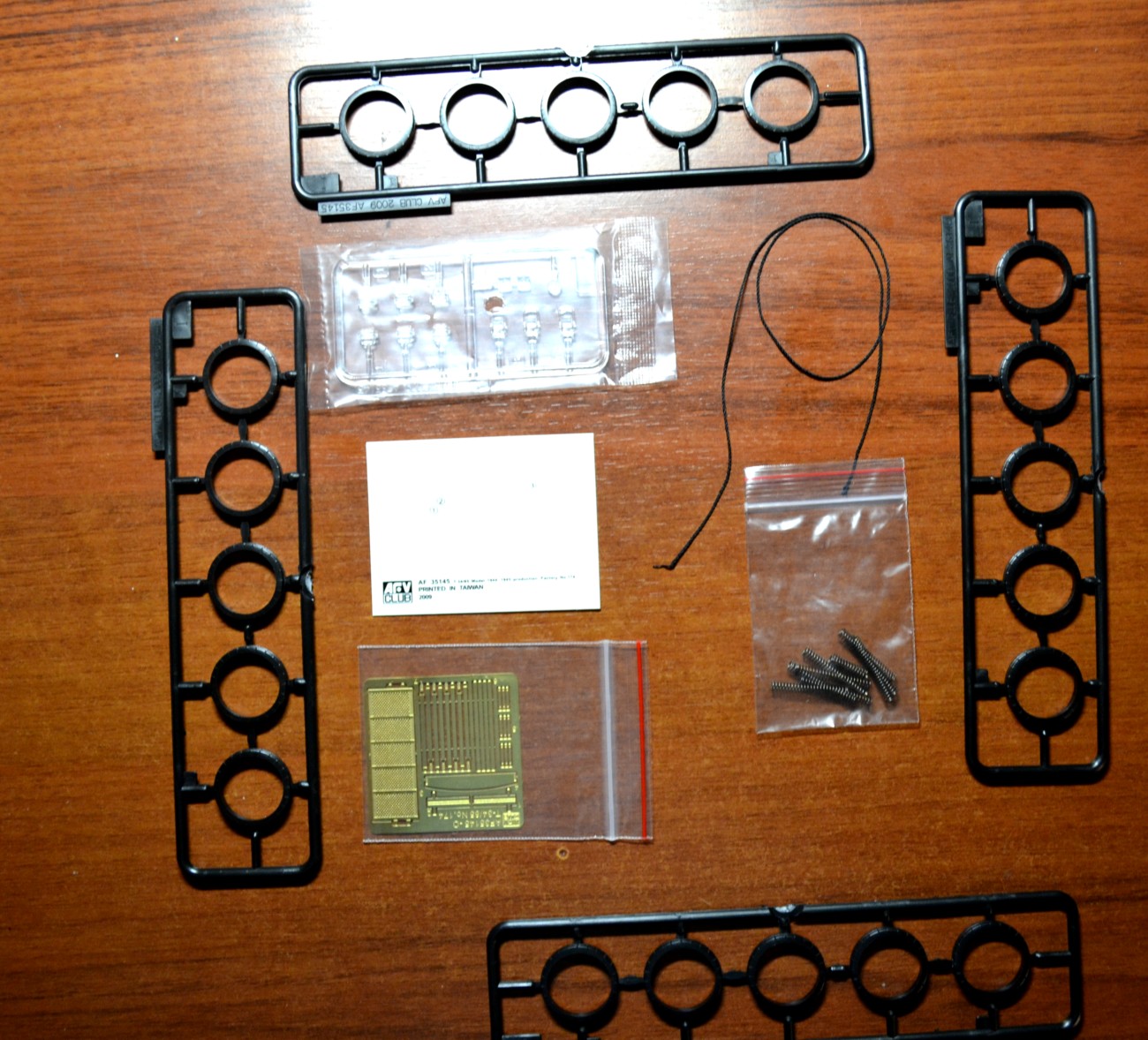 Коробка из плотного картона с красивым рисунком. Внутри 9 литников из светло серого пластика, ванна и верх корпуса, 4 литника с бандажами колес из черного пластика, литник с прозрачными деталями, небольшая плата фототравления, точеный ствол орудия, пружины, трос, виниловые гусеницы, декаль на 3 варианта.