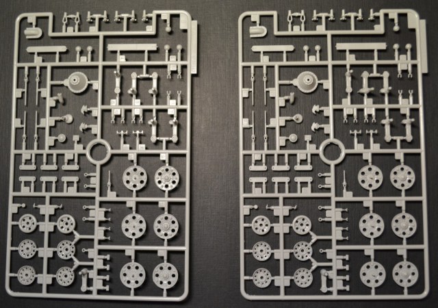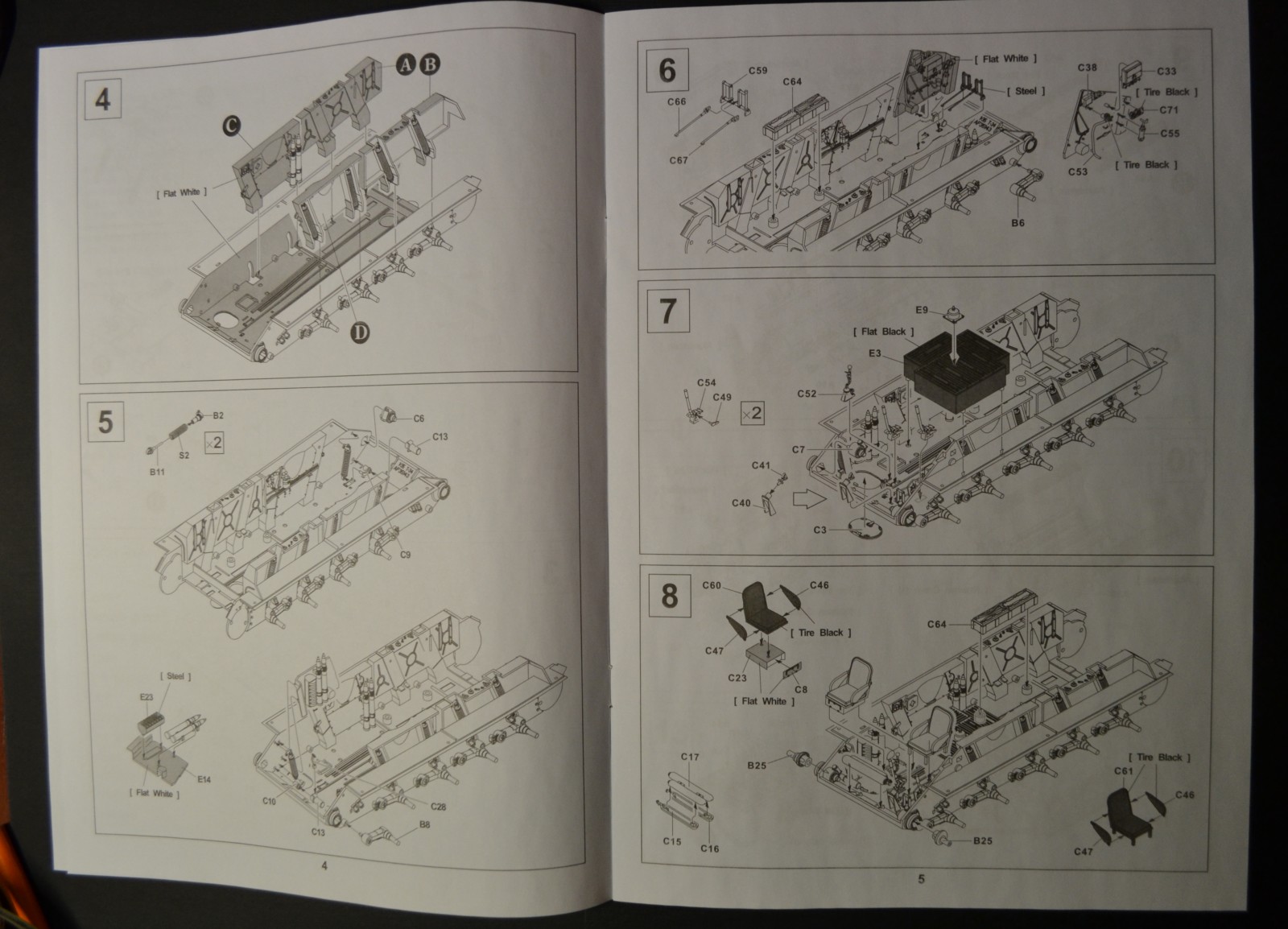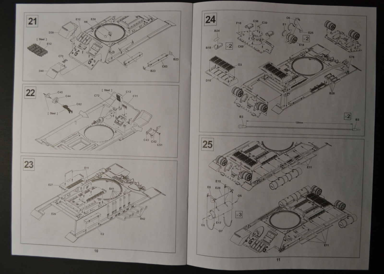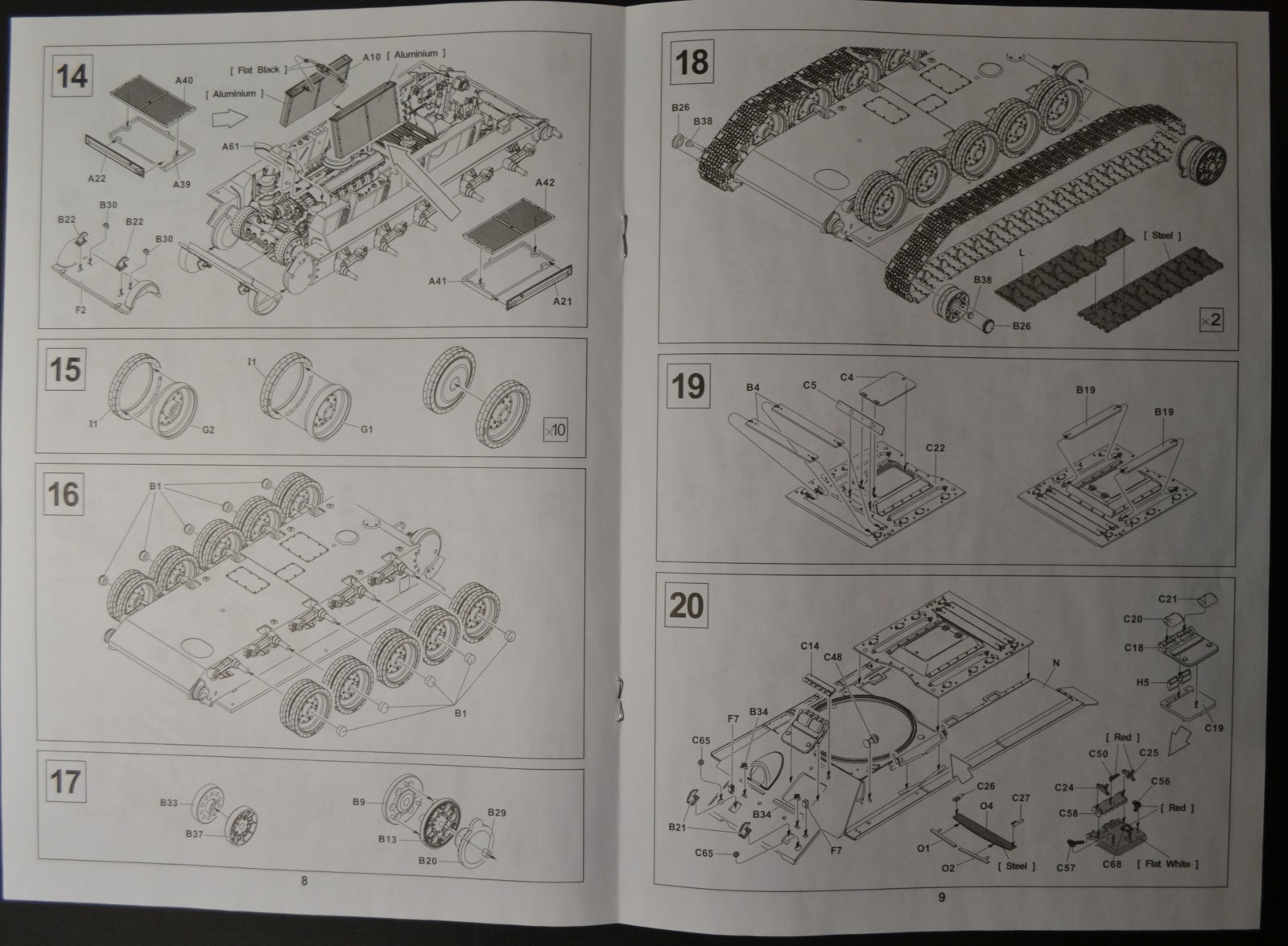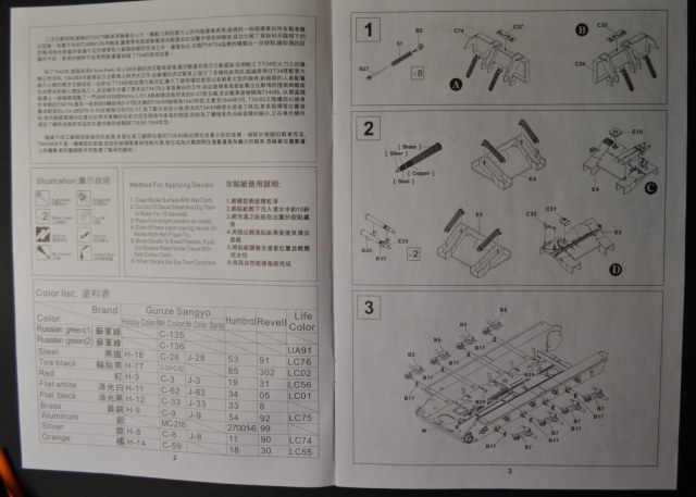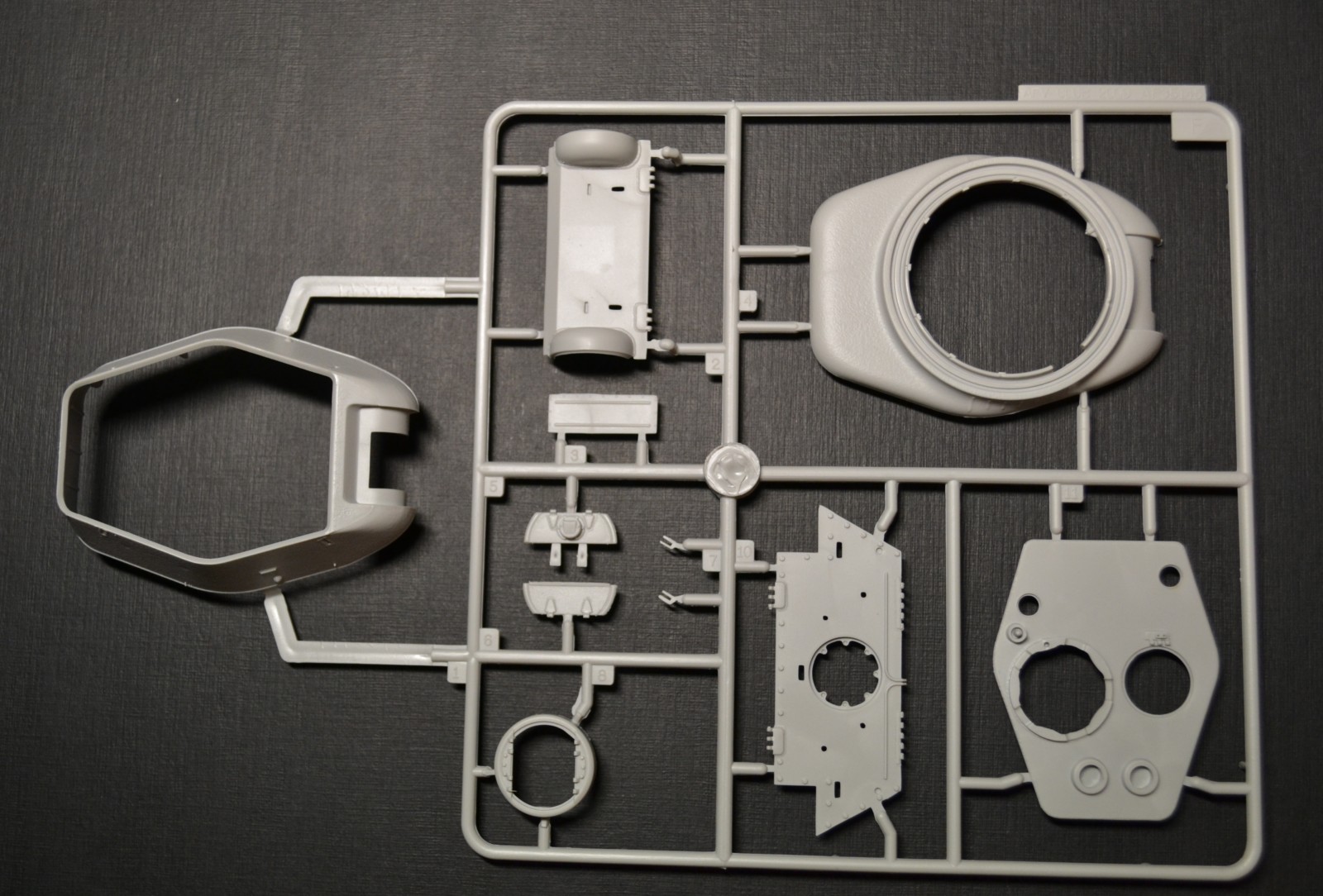 Коробка из плотного картона с красивым рисунком. Внутри 9 литников из светло серого пластика, ванна и верх корпуса, 4 литника с бандажами колес из черного пластика, литник с прозрачными деталями, небольшая плата фототравления, точеный ствол орудия, пружины, трос, виниловые гусеницы, декаль на 3 варианта.
