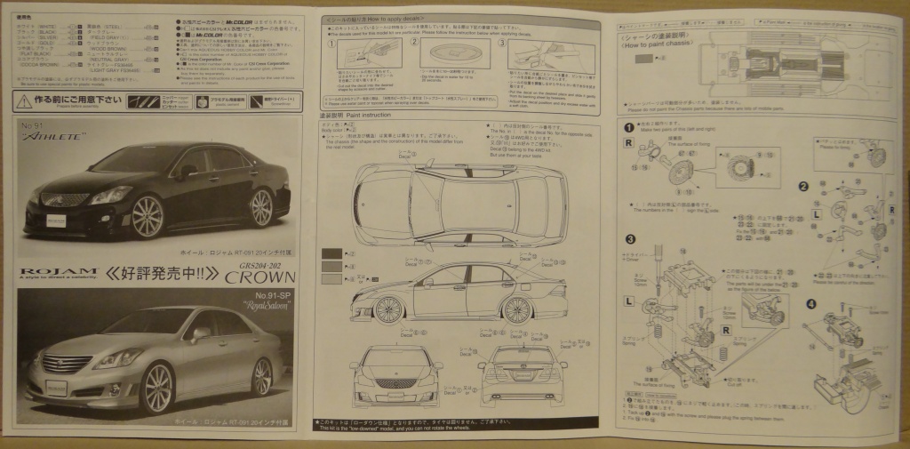 Приветствую Вас уважаемые Коропчане. Представляю Вашему вниманию творение фирмы Aoshima – это TOYOTA ROJAM CROWN GRS204. В коробке имеется понятная и подробная инструкция по сборке модели, салон автомобиля, днище, 8 литников серого, чёрного и коричневого цвета, 3 литника прозрачных деталей, листочек декалей, сетка, 3 литника хром, диски и резина . Всё это дело запаяно в пакетики и аккуратно уложено. Выхлопная система вылита целиком с днищем, двигателя нет, но имеются на ванночке остекленения солцезащитные козырьки и освещение салона. Так же нам предлагают рабочую подвеску. При осмотре облоя, утяжин и прочих неприятностей не замечено. Машинка интересная и качественная. Приятного просмотра. Всем спасибо за внимание.