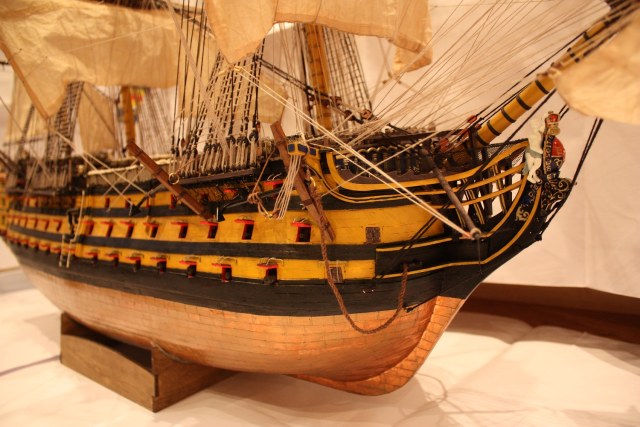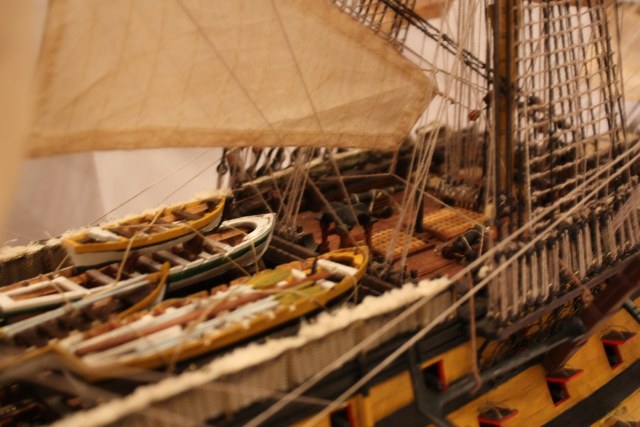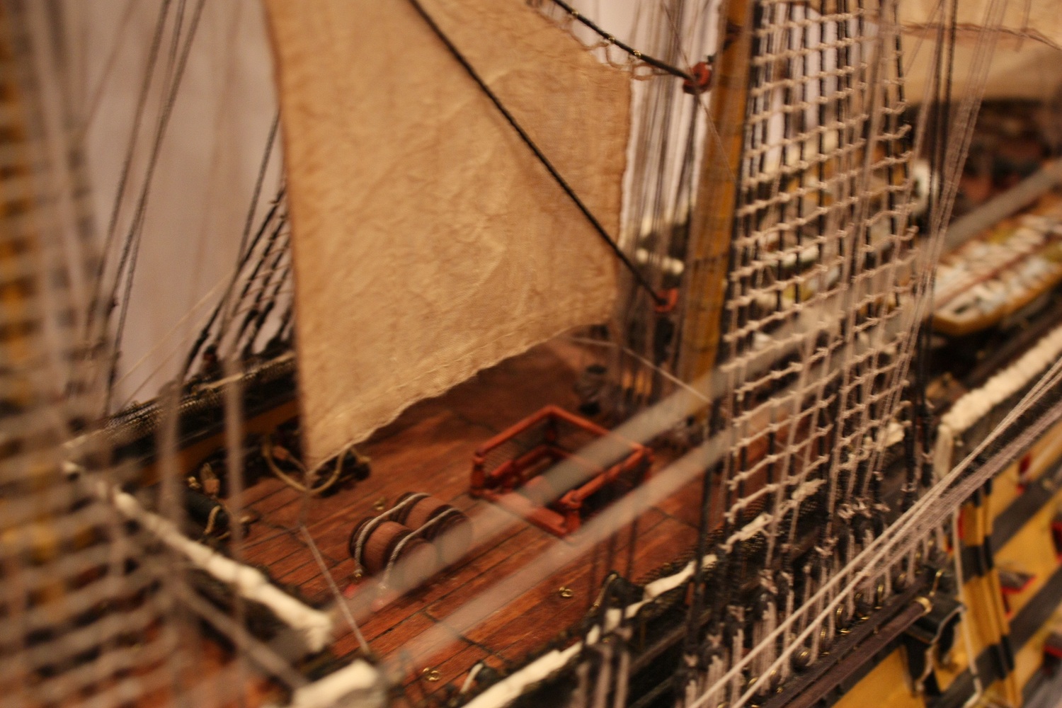 В очередной раз приходится бурчать о мелочах,которые губят большую работу.Что,не судьба была погладить утюжком паруса ,оттонировать чаем и "надуть" сахарком? Говорить о 33 метрах меди и положить в шлюпки эти куски бревна вместо рулей.Вант-путенсы-это вообще что-то!Вы прикинте: в звено вант-путенса человек пролезет в вашем масштабе.Щели в обшивке,выпуклые донышки бочек.И ,главное, обо всем этом говорилось не раз и не два...Нагло-белые решетки на гальюне прямо бьют по глазам неграмотностью.Конечно модель большинством направится в галерею,но это и обидно,что попадают туда модели,большеобъемные по работе,но подрезанные такими мелочами.