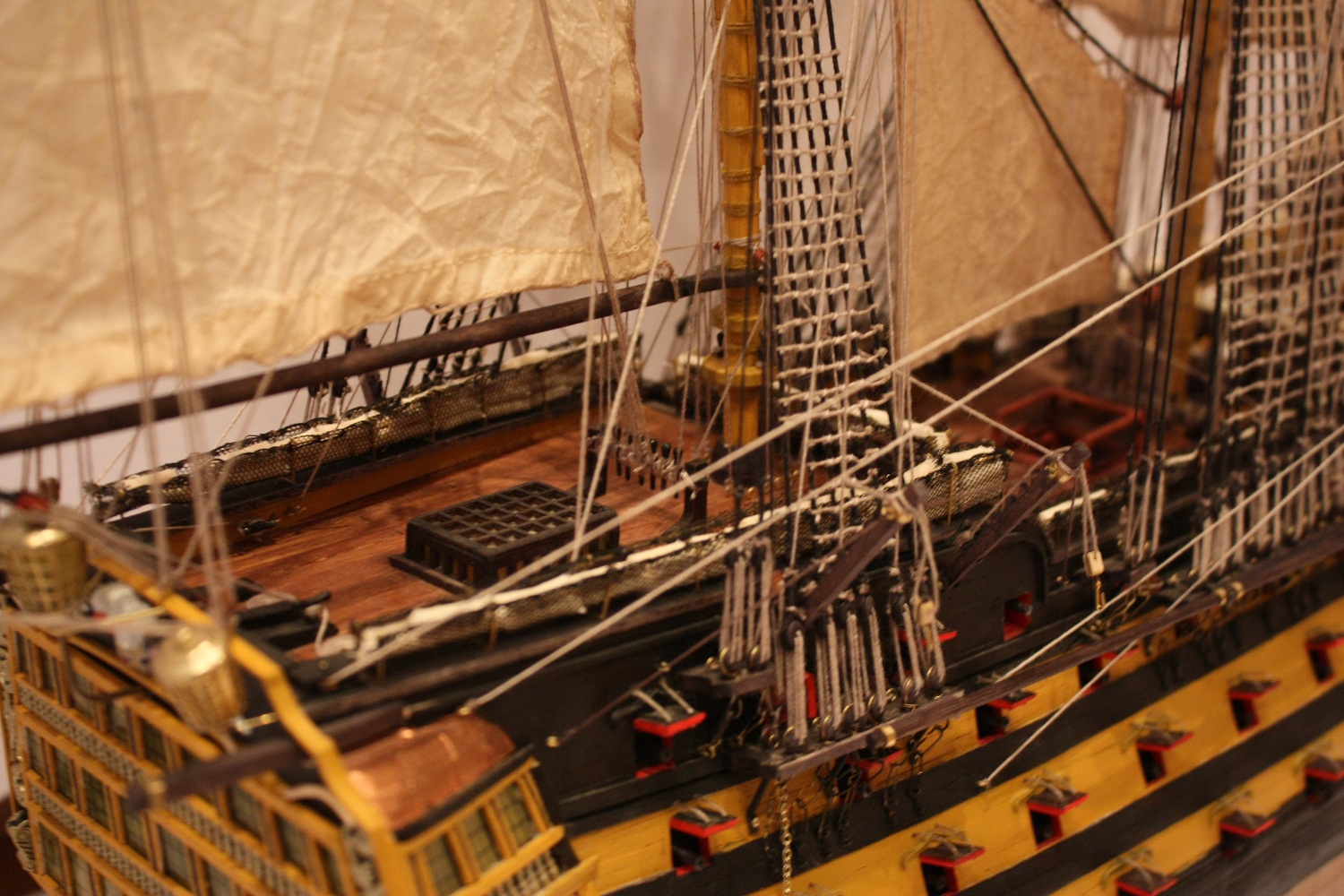 Ух какой же он здоровенный! Масштаб явно не 1:96, а 1:84-1:85. Модель хороша! Михаил, только явно прослеживается что ты хотел убежать от данной модели к другому проекту. Некоторые вещи ты сделал с усердием и любовью, а те, которые устанавливаются в конце- торопливо и небрежно.Поступаешь с ним (кораблем) как с девушкой которую разлюбил...Особенно это видно при постановке флагов, вымпелов. Скорей всего они ставились с немыслимой скоростью и на фоне "патрёпаных"парусов выглядят очень ярко и гладенько. Решетки конечно стоит малость затонировать, модель более смотрибельна станет. Не торопись, доработай, жизнь длинная!