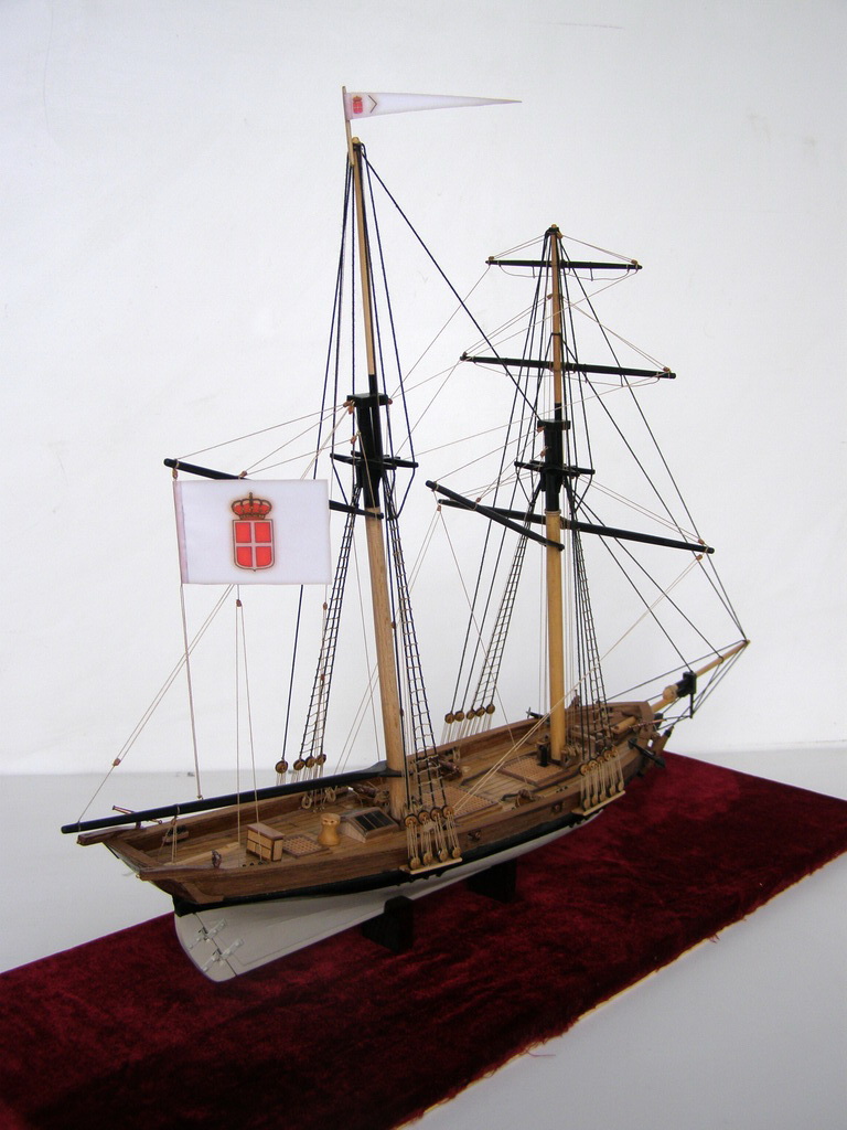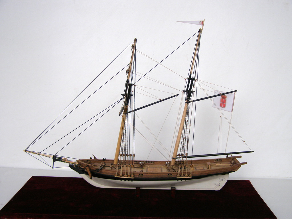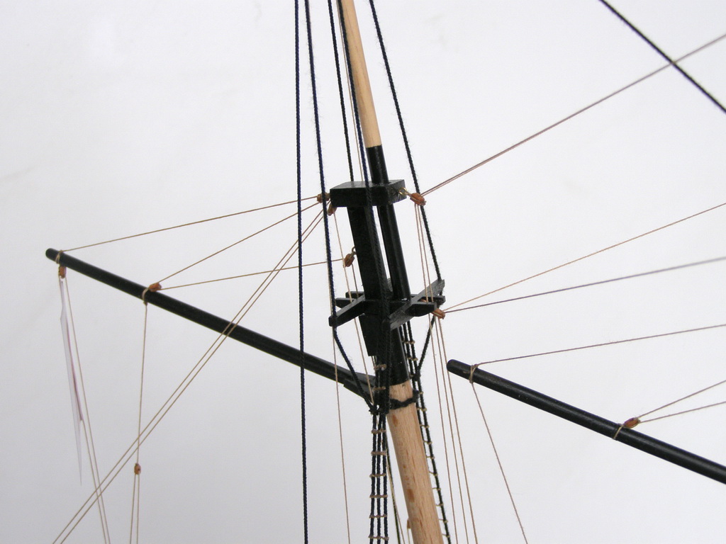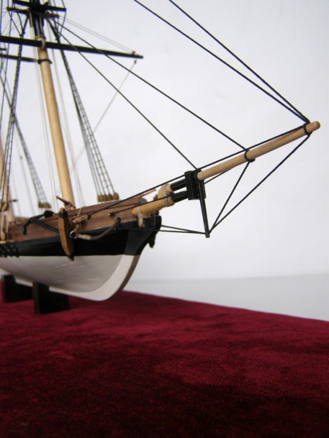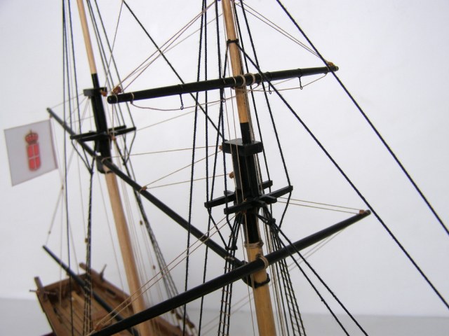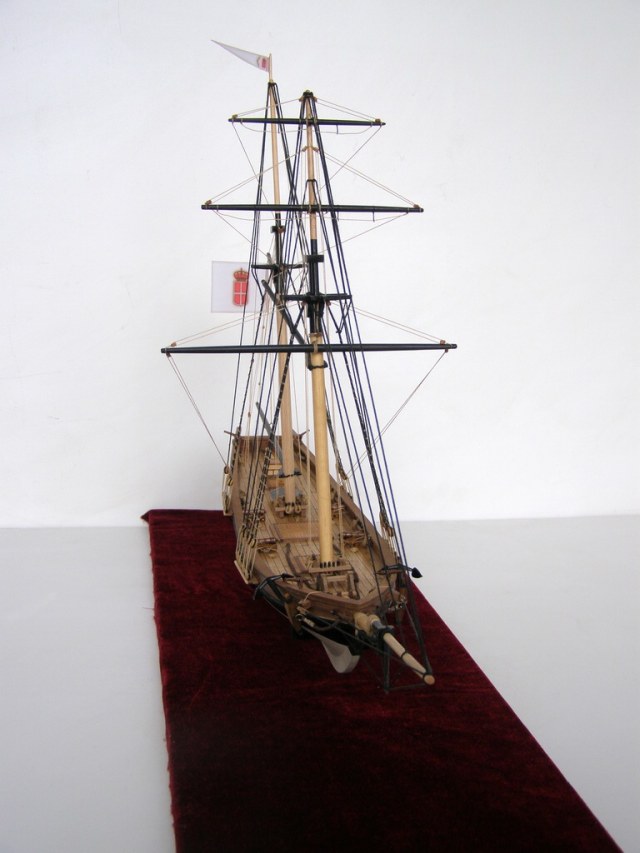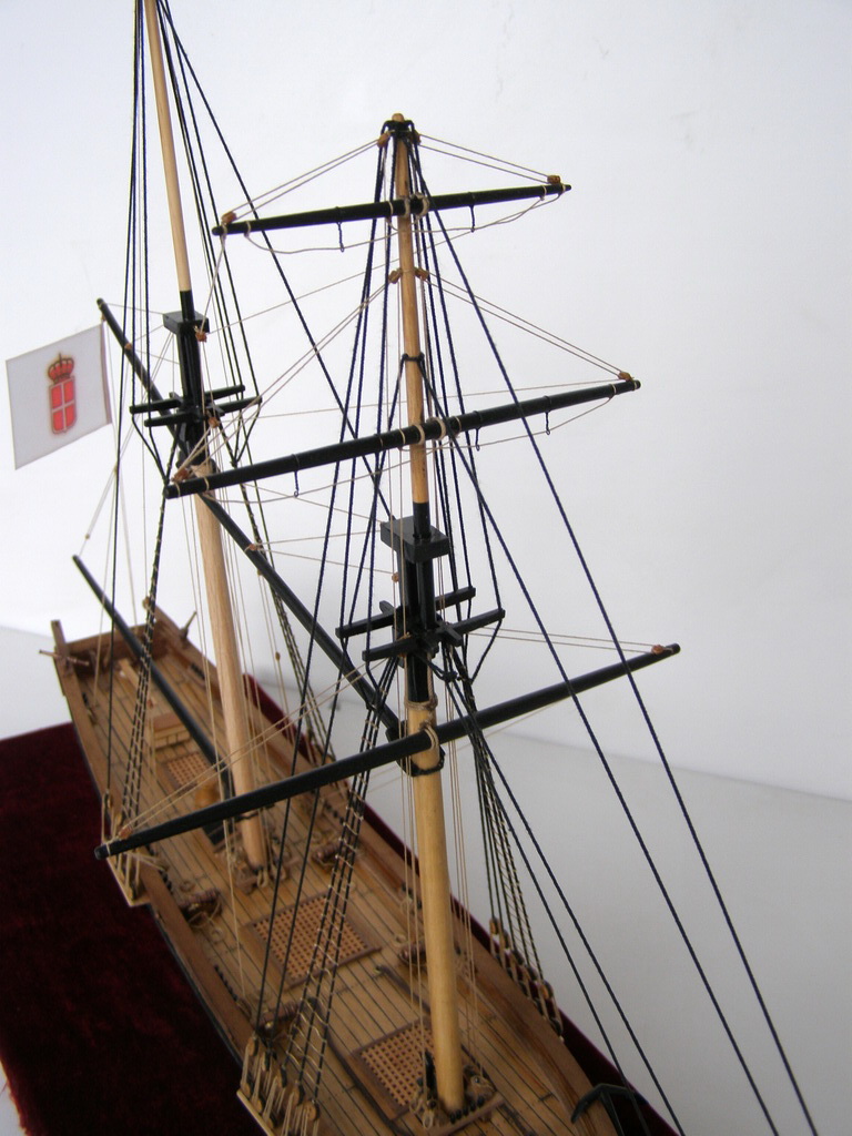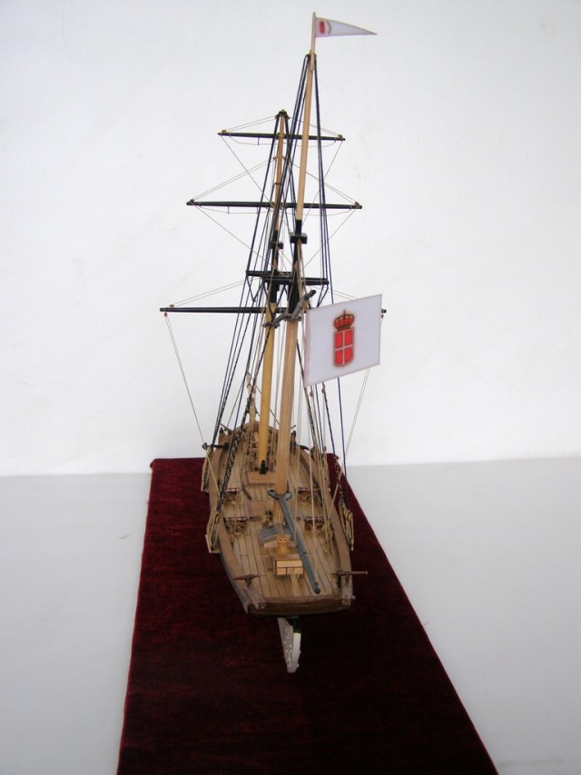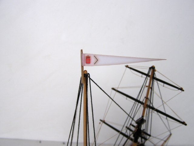 "Привязку" пушек резко переделать,глядя на того же Курти.Безграмотно на 100%.На мачты одеть клотики.И флаги к флагштоком не "прибивают.Фал должен быть.Про якорь уже сказали.А так чистенько и аккуратно.Более мелочно не вникал.Да,якорный канат на кнехте лежит как раз наоборот. Флаг можно сделать и на папиросной бумаге.Акрилом разрисовать,а потом намочить и помять его как он должон "струиться"
