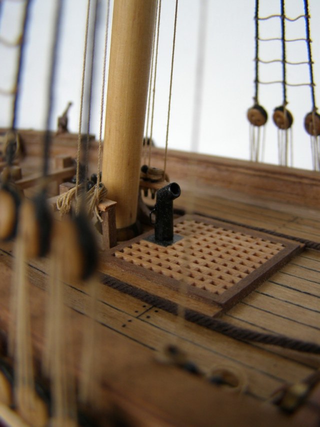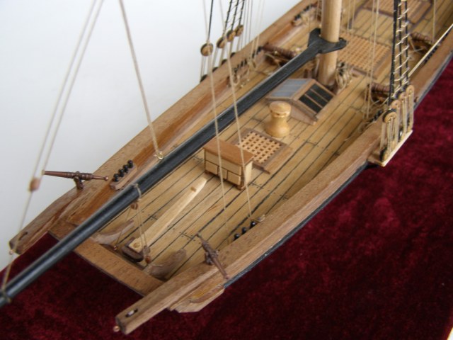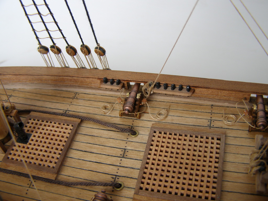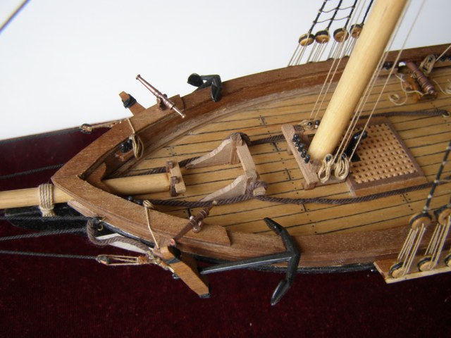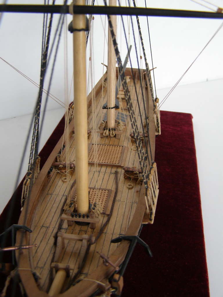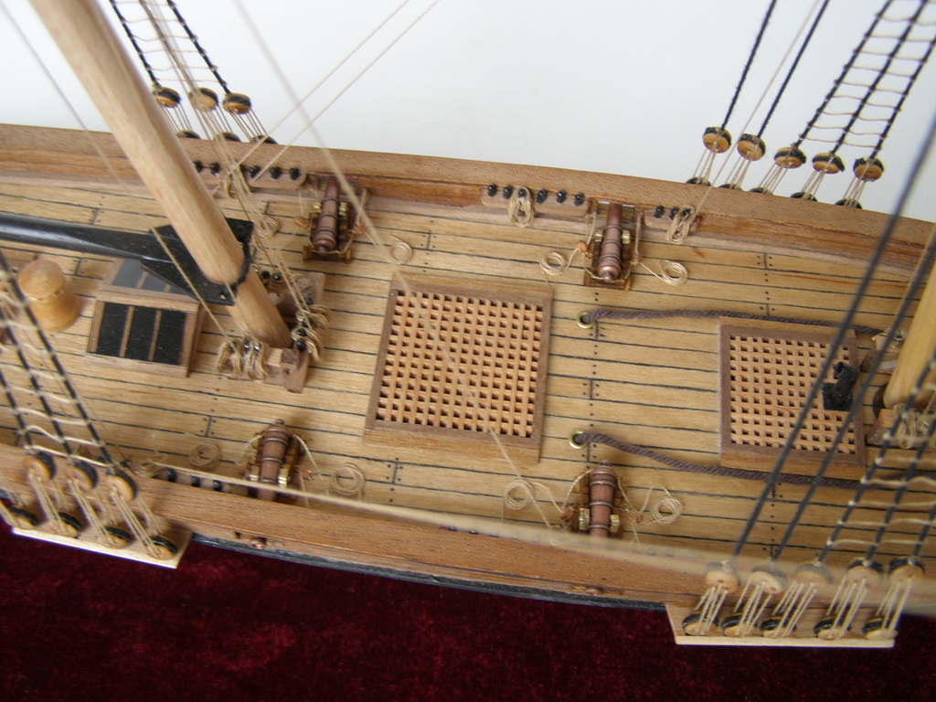 Вы хочете песен? Их есть у меня.Из грубых: наглая фанера на насовом планшире,вернее его усилении.Какая-никакая должна быть кат- балка.Якорь просто брошен. Где вымбовки?где-то рядом должны быть заскладированы.Шлюпка какая-никакая должна быть.Шлюп-балки-то пустые стоят.Халтурой я бы не назвал,но... не зацепило.Пустоватая модель.Я не к тому,что палубу надо забивать чем ни попадя,но...вот скажем откатные тали на пушках часть этой пустоты скушали бы.Укладки ядер около пушек или около люков не помешали бы.В таком масштабе около пушек не испортили бы вида пушечные причиндалы.