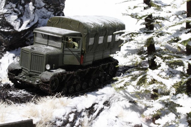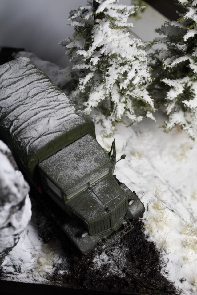 Модель тягача сделана в принципе из коробки. Были поставлены гуси от Фриула,заменён брезент на салфетку и так,по мелочи.