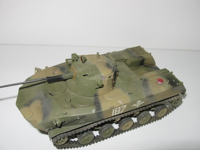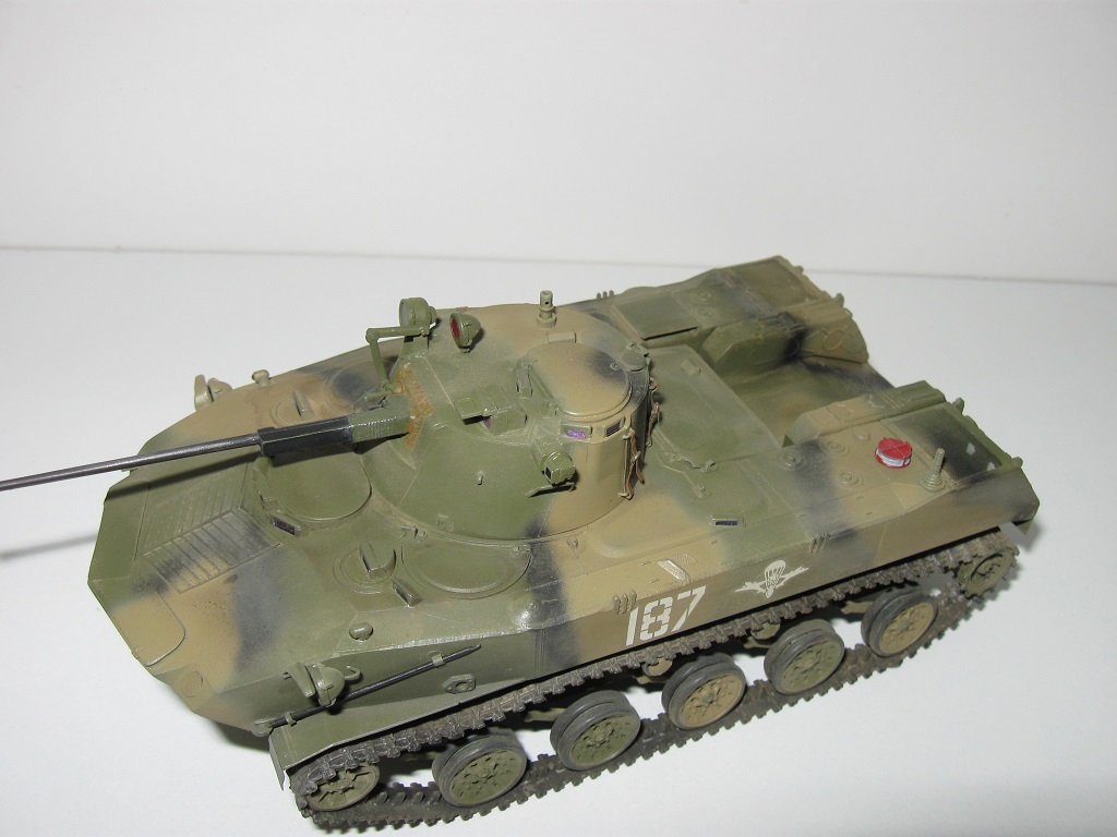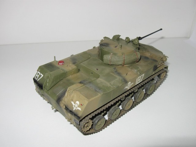 Доброго времени суток коллеги по хобби! Представляю Вашему вниманию свою модель БМД-2 от Звезды набор простенький но вполне приличен, только винил-траки оставляют желать лучшего, хотел заменить на смолу не нашел в и-нет магазинах. Левый винил горе трак не в какую не хотел вставать на своё место, сначала гребни оказались длиннее – пришлось подрезать в районе звёздочки, затем грунт с краской начал осыпаться. Поэтому за бугор на опорных катках слева сильно не судите. В чертежи не вкладывал не люблю этого делать - вгонять в миллиметры.