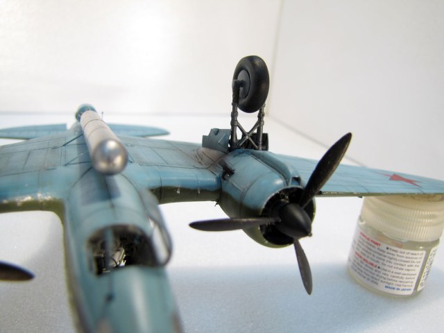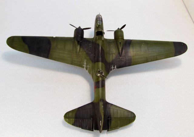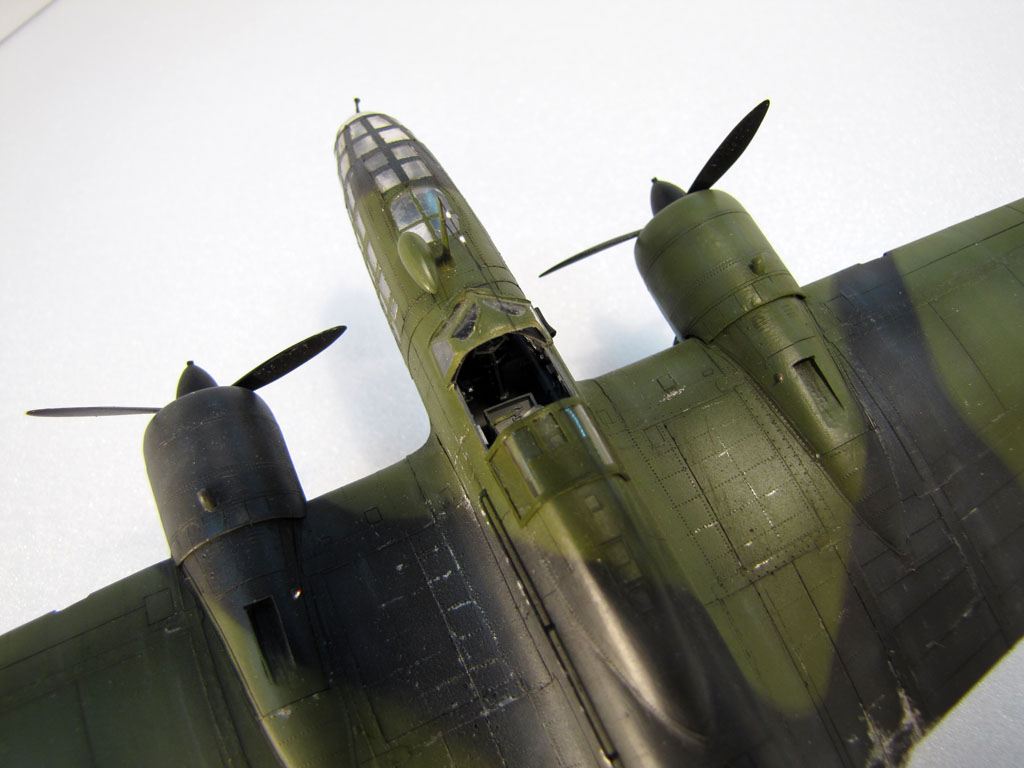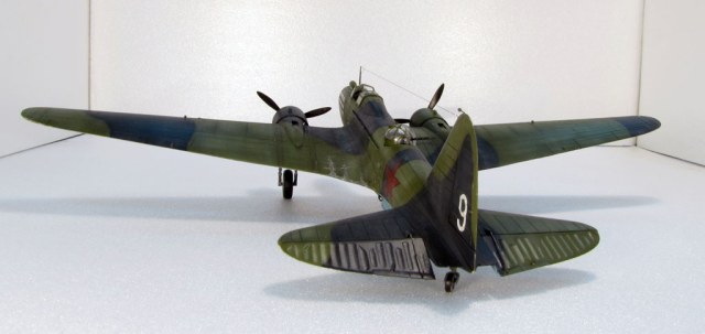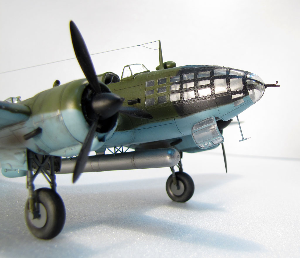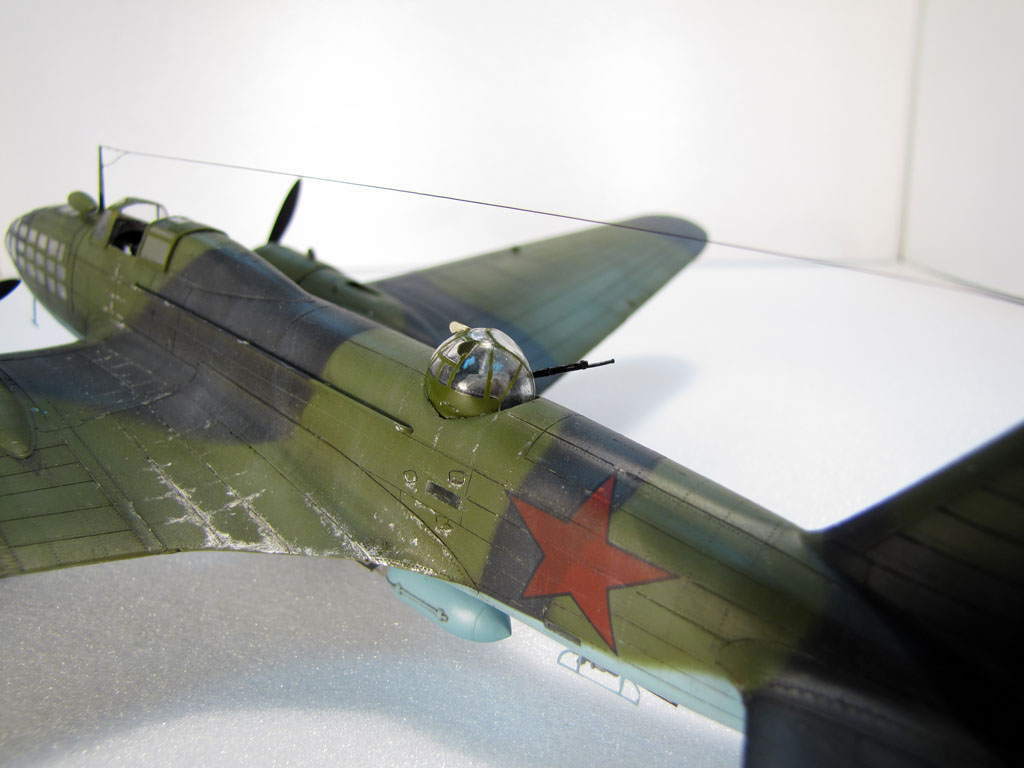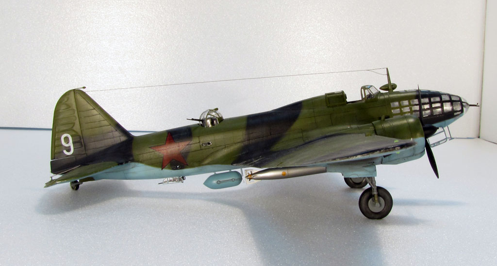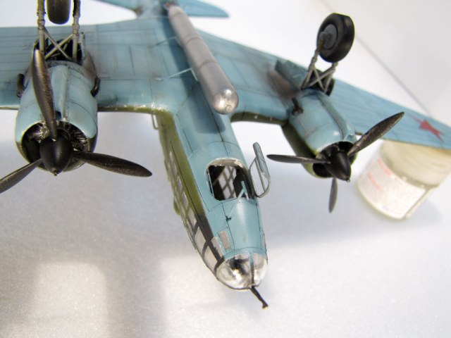 Если в двух словах- то переделано ВСЕ! Фюзеляж взят от Звезды, увеличен диаметр и исправлена геометрия. Центроплан и ОЧК (отъемная часть крыла) взяты также от Звезды. У центроплана изменена геометрия (нарощена толщина и изменен установочный угол), крыло выставлено на правильный угол. Мотогондолы от Ревелла, в них прорезаны "совки" выхода воздуха из маслорадиаторов, полностью сделан интерьер ниш шасси. С нуля сделаны кабинеты летчика, штурмана и стрелка-радиста (нормально все видно только у летчика, так что особо можно было не выпендриваться). Фонарь штурманской кабины взят у Ревелла (вместе с кусками фюзеляжа). Двигатели, капоты, винты, коки винтов и фонарь летчика (обе части) были заказаны у А.Н.Козырева (небезызвестный КАЮК). Все шикарного качества, единственное, что переделывал- каналы радиаторов, т.к. они кривые, взял у Ревелла. На моторы кинул проводку и толкатели клапанов. Полностью сделаны турели стрелков, для УТК взял колпак от Ревелла, остальное, включая пулемет- самодел, и люковая и носовая турели (обтекатель от Ревелла) также полностью самодел, стволы всех пулеметов- иглы от шприцев. Переделаны рули высоты и направления (высоты-Ревелл, направления- Звезда), вырезаны и отклонены триммера, сделаны кабанчики и тяги управления. Из папиросной бумаги и ПВА (спасибо В.Клочкову за идею) сделан чехол на заднюю опору. Сделана посадочная фара- из фольги выдавлен отражатель, обтекатель- упаковочная пленка. Из пленки также сделаны створки люковой стрелковой точки и ветровой щиток верхней турели. Стойки шасси взяты у Ревелла (более правильные), а вся механизация сделана с нуля. Створки шасси также полностью сделаны с нуля. БАНО и строевой огонь сделаны из шпажек. Полностью перерезана вся расшивка. Впервые в таких объемах применил фольгу-самоклейку, результатом более чем доволен. После грунтования накатал клепку, модель с ней прямо-таки "заиграла". Торпеда взята у Ревелла (у Звезды нехилый эллипс в сечении), сделаны стабилизаторы из доширакпласта и лопасти винтов из пивжести. Контейнер более правильный оказался у Звезды. В итоге всех манипуляций модель максимально близко легла в чертежи.
